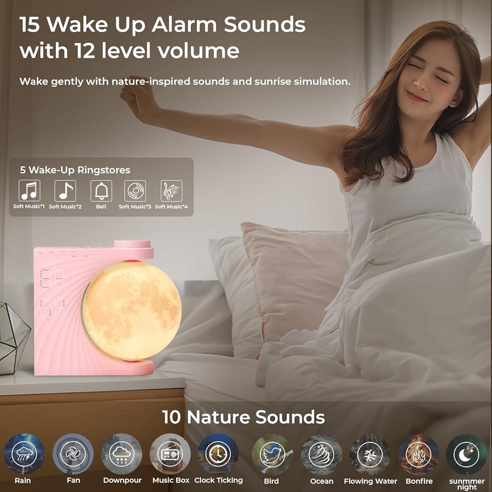 【2024 New Moon Lamp Alarm Clock】Realistic full moon shape, the surface of the moon lamp is very close to the lunar moon, novelty and charming. Wake up naturally with our INSSISAIN Sunrise Alarm Clock, featuring 10 minutes before your alarm time, the white light gradually turning on from 1% brightness to 100% - the perfect sunrise alarm clock for heavy sleepers, adults, and seniors.