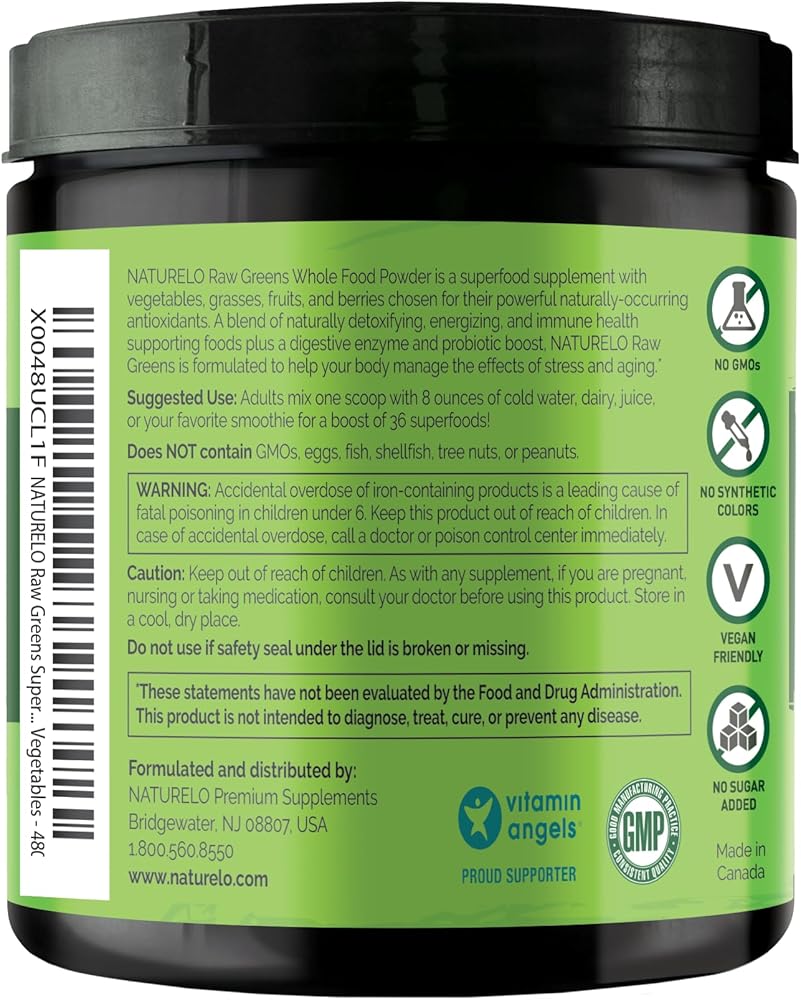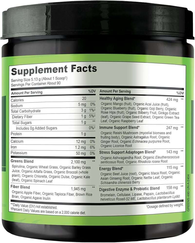 Organic Superfood Blend: Made with nutrient-packed organic whole foods, including raw greens like spirulina, barley grass, alfalfa, wheat grass, chlorella, kale, spinach, and broccoli, and fruits like acai, blueberry, and goji berries.