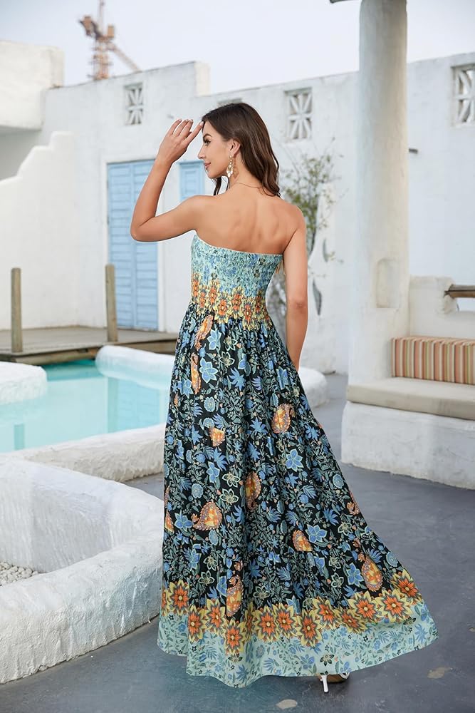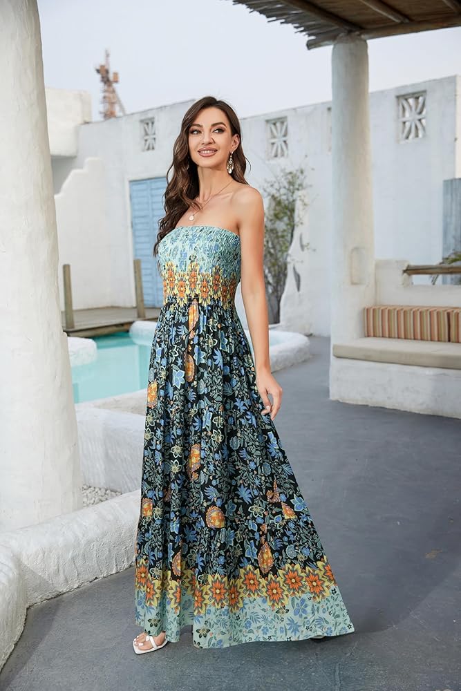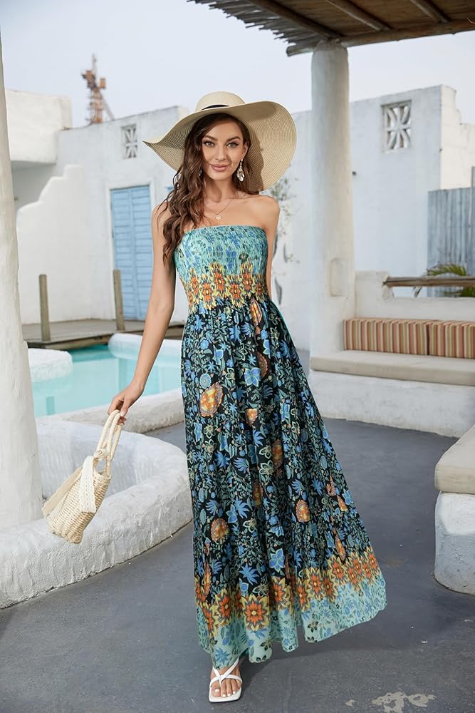 Women Strapless A Line Maxi Dress Tube Top Backless Casual Summer Dress