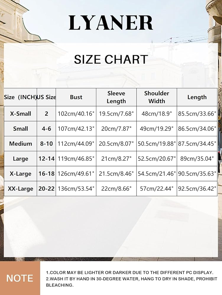 X-Small: Bust: 102 cm/40.25", Shoulder: 48 cm/19", Sleeve: 19.5 cm/7.75", Length: 85.5 cm/33.75",