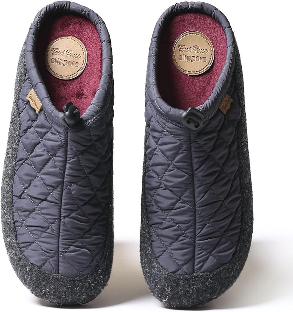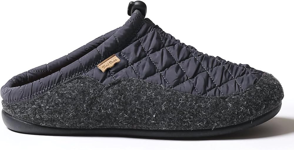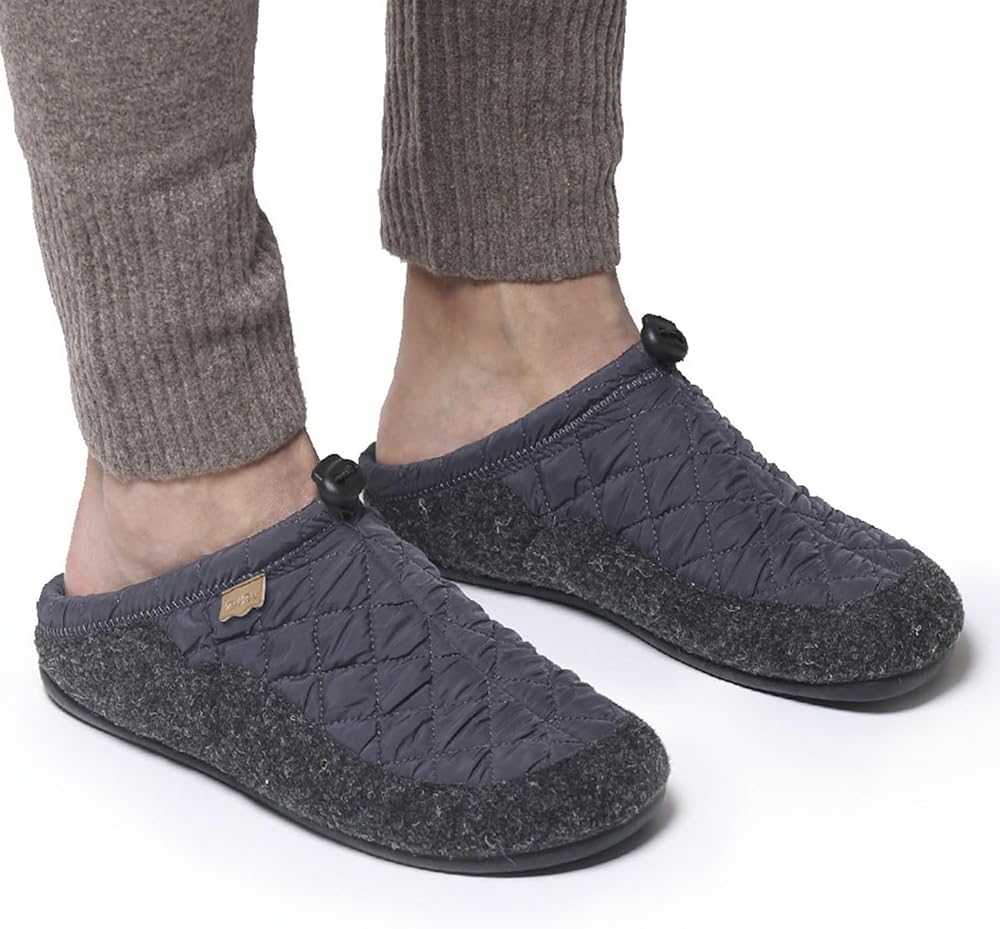 NADIR-UM. This men's clog house slipper is made in solid tones combining felt and quilted fabric. The entire sole is made of non-slip rubber. The sole is flat and features a removable insole with 2 cm thick wedge on the heel part. This model fits the usual size, if you are between two sizes choose a larger size. It is not advisable to wash the slippers in the washing machine. We recommend you check the care guide for how to maintain them.