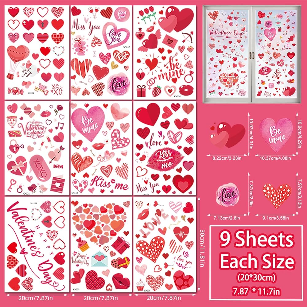 The Material of Valentines Window Clings Decorations: These Valentine heart window cling stickers for glass are made of high-quality PVC, so no adhesive is needed, which is easy to stick and remove