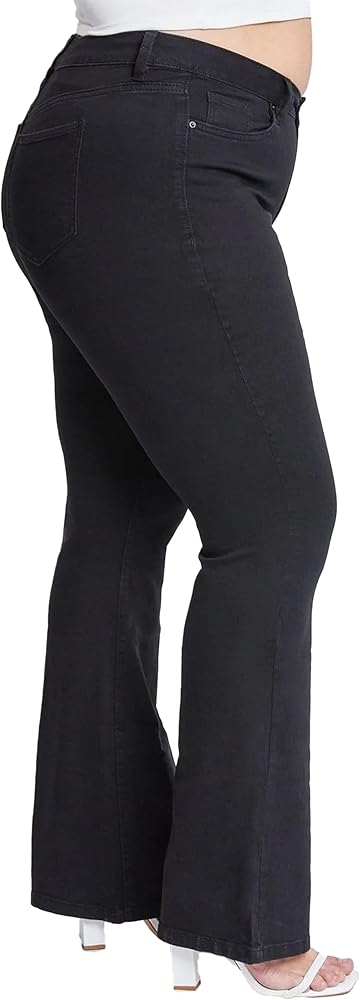 Our Women's Plus Size Hyper Denim Super Stretchy Flare Jean is ready for work, date night, and everything in between. The super-soft fabric makes this piece even more comfortable than they look. Featuring a 5-pocket construction, single-button closure with front zip, and belt loops. These hyper denim 'fits offer you the ultimate stretch with the maximum comfort every wear. Measurement (Based on size 2X) - Inseam: 33” - Rise (To top edge of band): 12” - Leg Opening: 23” Composition: - 60% Cotton/ 27% Polyester/ 11% Rayon/ 2% Spandex • Machine wash cold. • Model is wearing a size 1X.