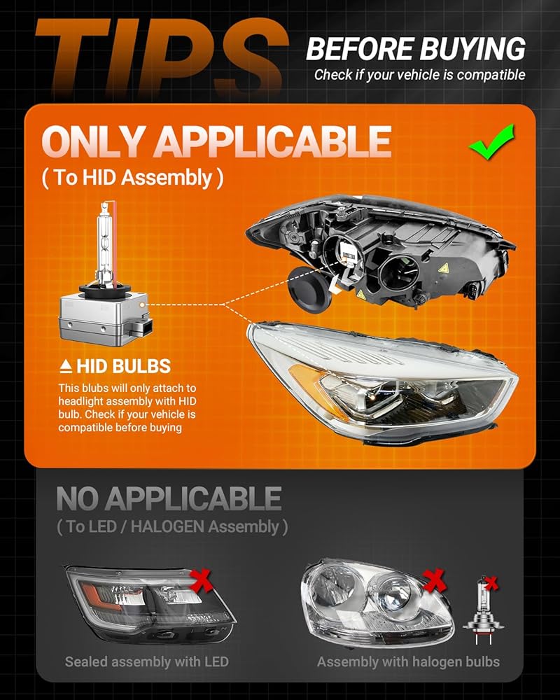 【 Important 】Sealight D1S HID bulbs only replace D1S HID assembly bulb, NOT fit your car stock halogen /LED assembly, even system says "fit".