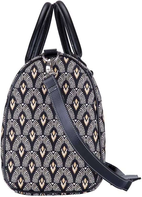 This travel bag for women is fastened with a double zip at the top; contains an inner zip pocket for storage; has a reinforced base with four studded feet for support and has a pair of sturdy faux/vegan leather handles for carrying.