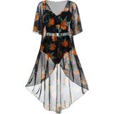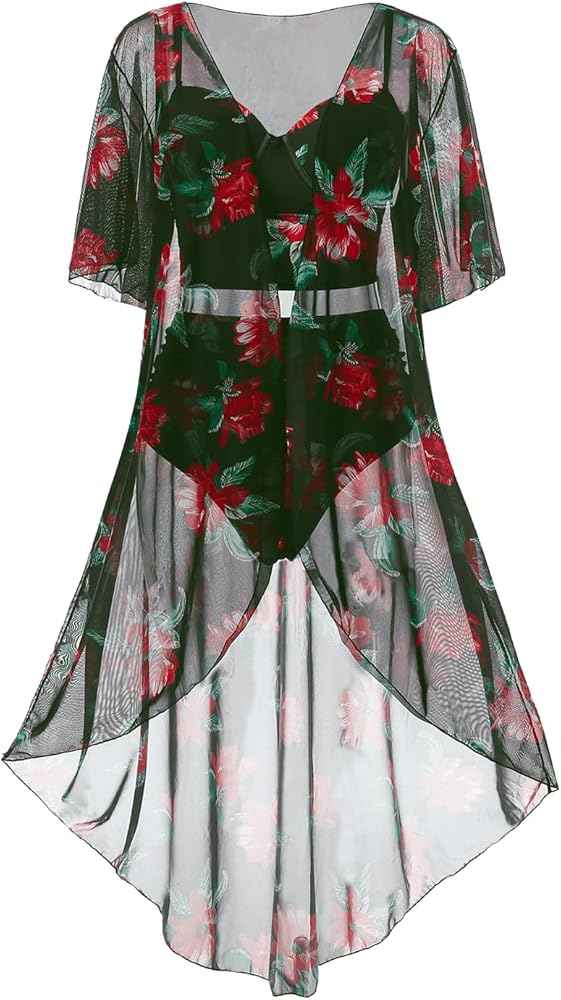 This three-piece swimsuit is designed for plus size women and includes a swim tank top, swim briefs, and a see through mesh cover up.