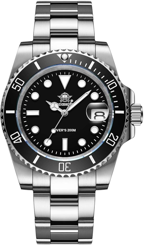 Features: Japanese quartz movement, no need hand winding, unidirectional rotating bezel, premium 316L stainless steel, synthetic sapphire crystal day window with bezel protruding magnifying glass, screw-in crown, double safety buckle