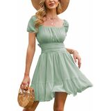 Feature: tie back, square neack, ruched bust, smocked waist, elastic high waist, lantern sleeve, long sleeve, elastic cuff, above knee length, A line, slim fit, swing and elegant vintage chiffon dress.
