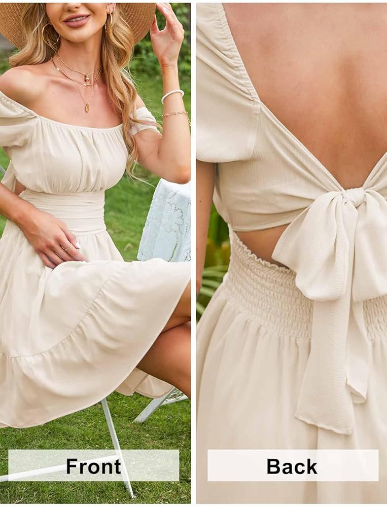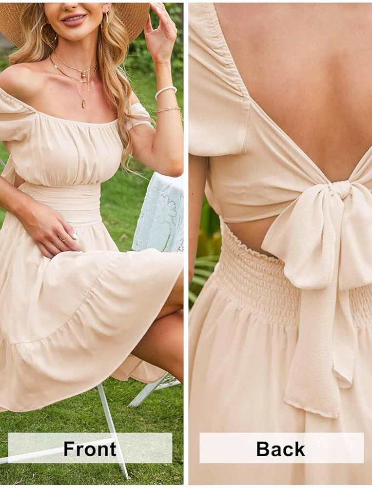 Design: The elastic smocked waist dress shows the body curves and hide tummy pretty well. Sexy tie back with adjustable self-tie bowknot, pretty ruffle hemline finish.