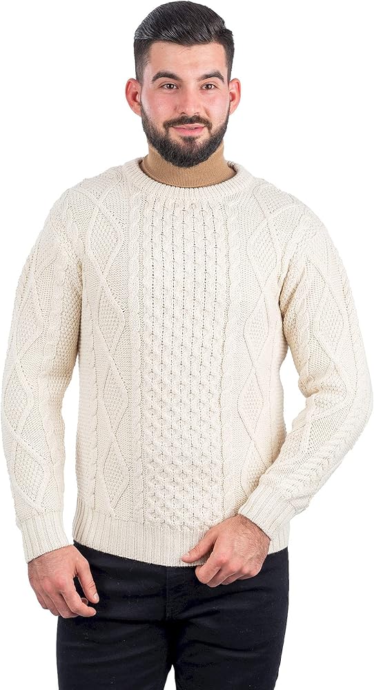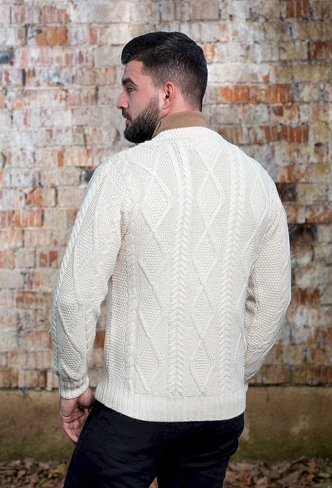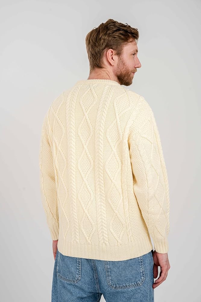 This stylish Mens Aran Sweater is a classic made with a modern wool blend of 30% merino wool and 70% acrylic fibres. The sweater is a traditional Irish Aran piece that features cable and patterns knit on the front and back of the garment.