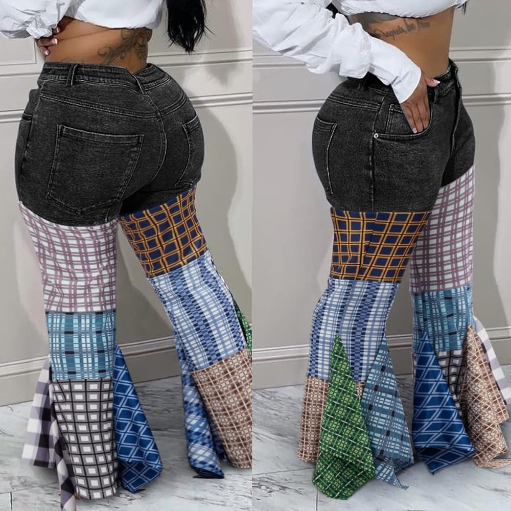 Feature: Bellbottom jeans, plaid patchwork, skinny flare jeans, asymmetrical ruffle hem denim pants, bodycon long pants, irregular plaid pattern, color block jeans for women.