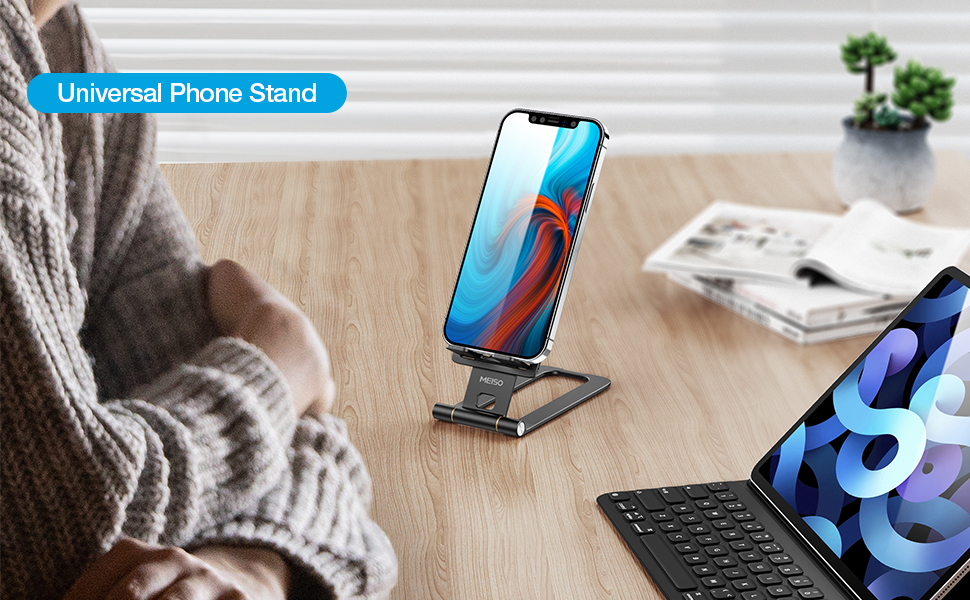 WIDE COMPATIBILITY: MEISO cell phone stand for desktop fits most 4-10” smartphones, tablets, and e-readers. It's compatible with iPhone 12/11/MAX/XS/XR/X/8, Samsung Galaxy S21/S20/S10/S9, Samsung Tab, Google Nexus, Kindle, etc. Please note that we recommend setting 8-10 inch devices in landscape mode to provide more stability.