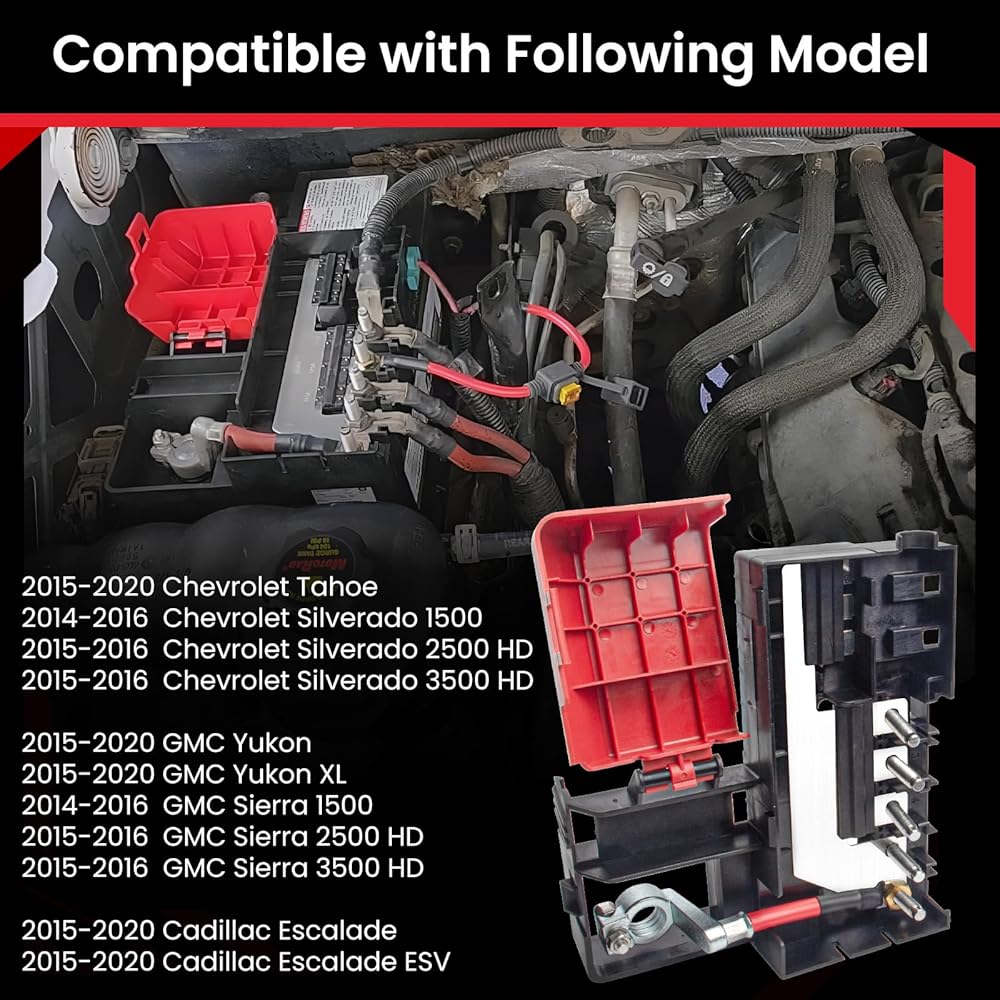 【Exceptional Compatibility】Our battery fuse block is expertly designed to fit a wide range of vehicles, including 2015-2020 Chevy Suburban/Tahoe, 2014-2016 Chevy Silverado 1500, 2015-2016 Chevy Silverado 2500 HD/3500 HD, 2015-2020 GMC Yukon/Yukon XL, 2014-2016 GMC Sierra 1500, 2015-2016 GMC Sierra 2500 HD/3500 HD, and 2015-2020 Cadillac Escalade/Escalade ESV. This compatibility ensures a perfect fit and seamless integration with your vehicle's electrical system, providing peace of reliability