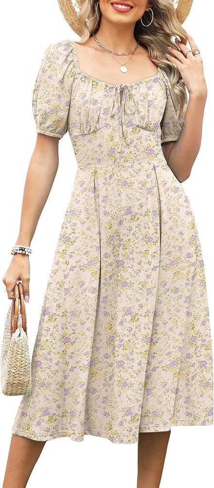 Caracilia Women Summer Casual Midi Dress Puff Short Sleeve Square Neck Floral Wedding Guest Party Graduation Dress