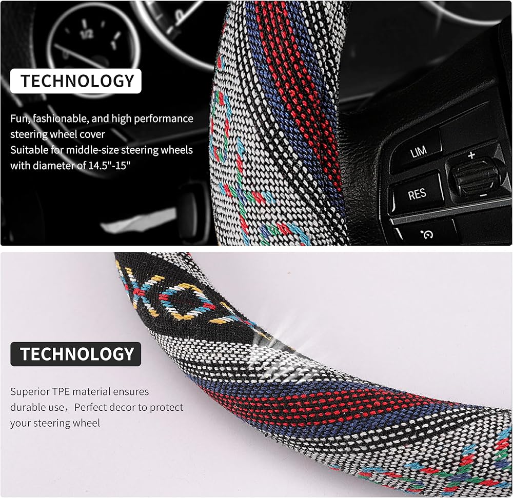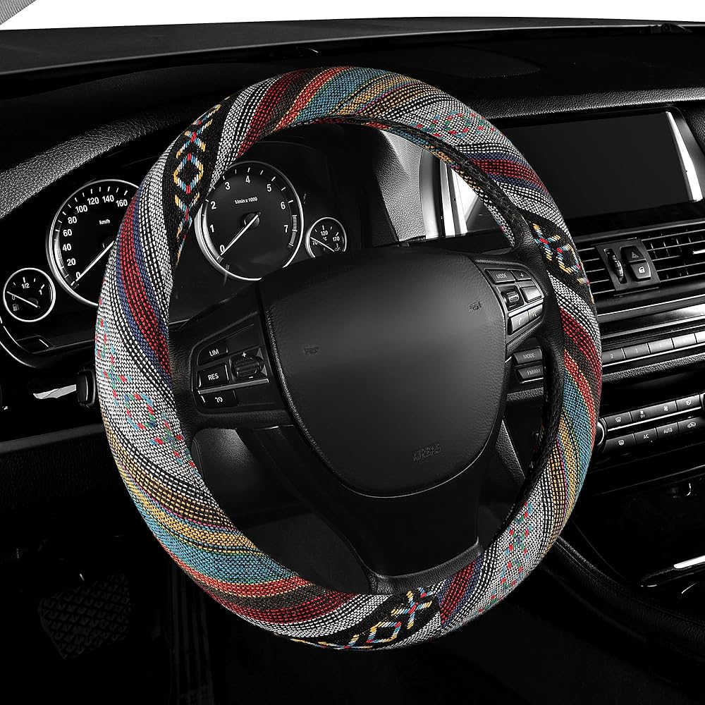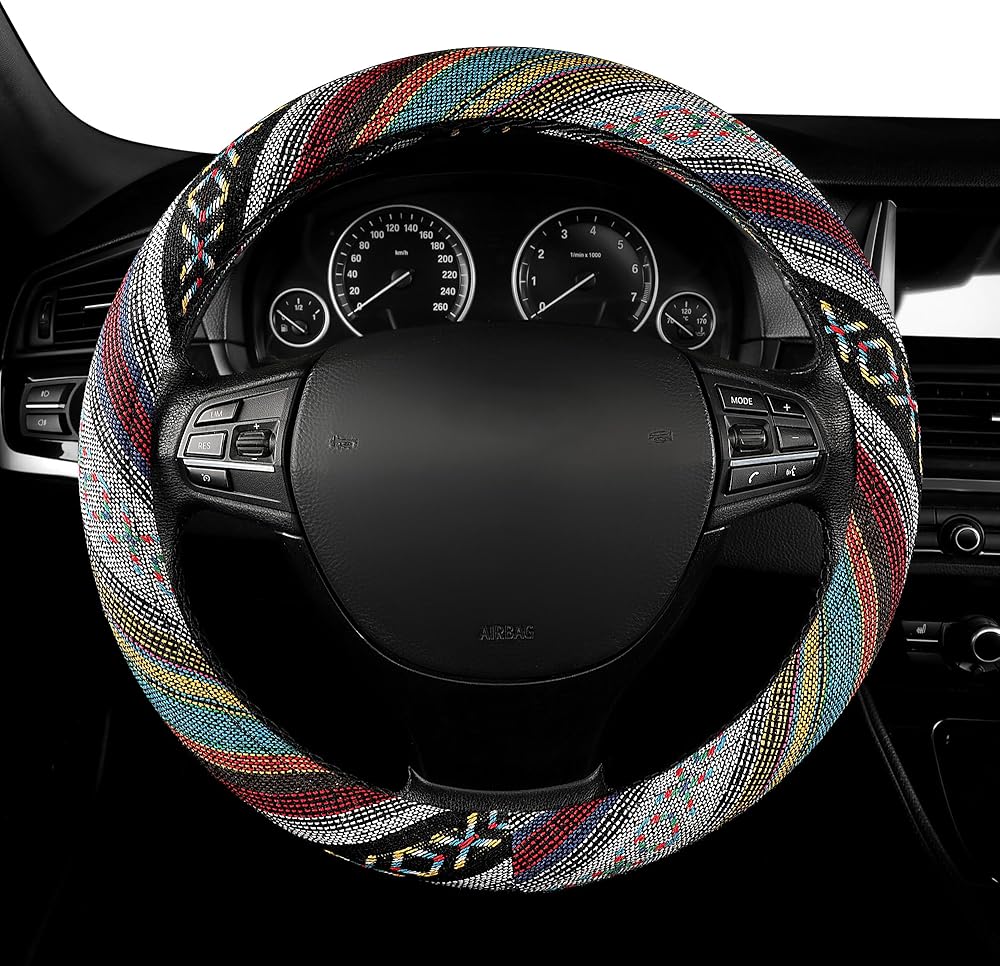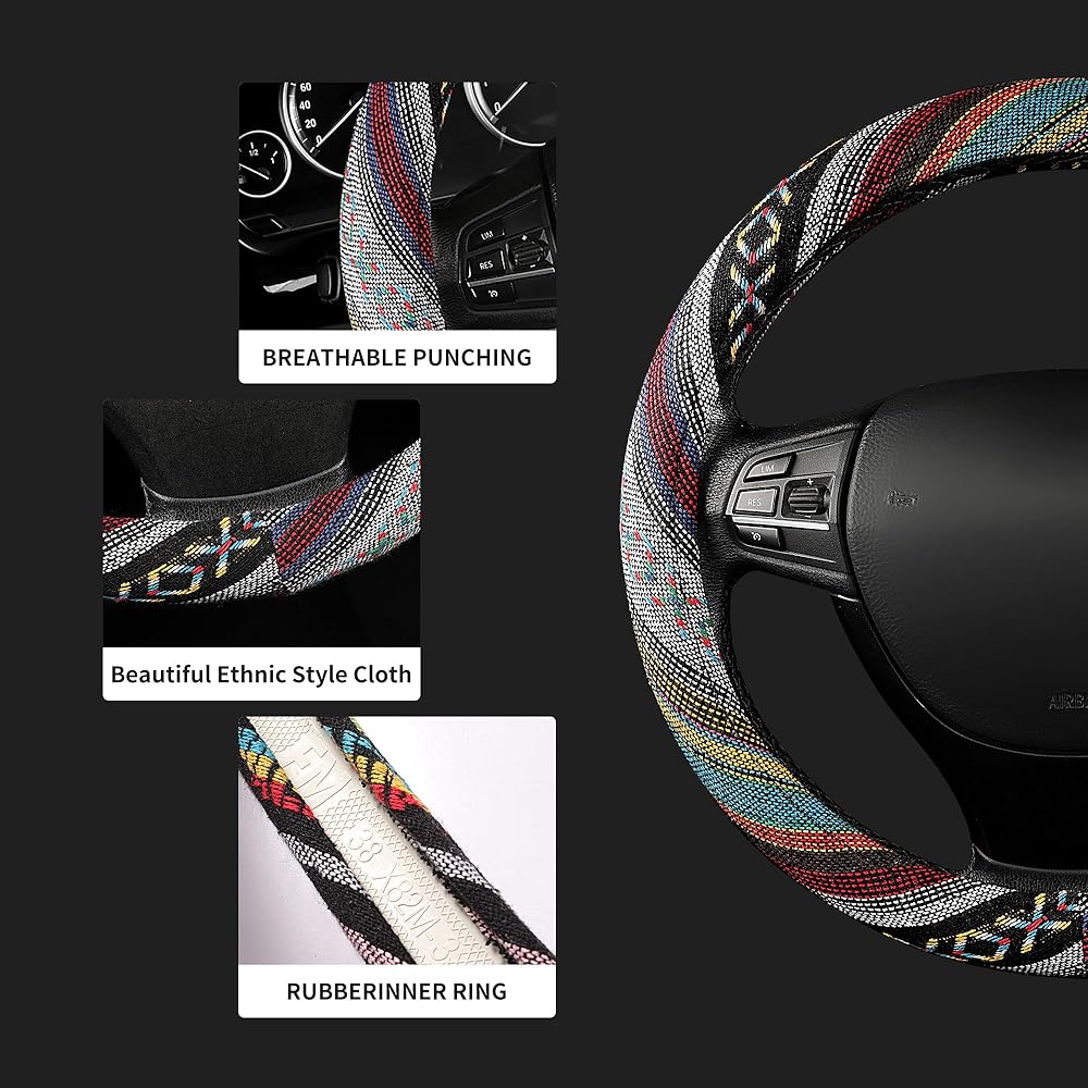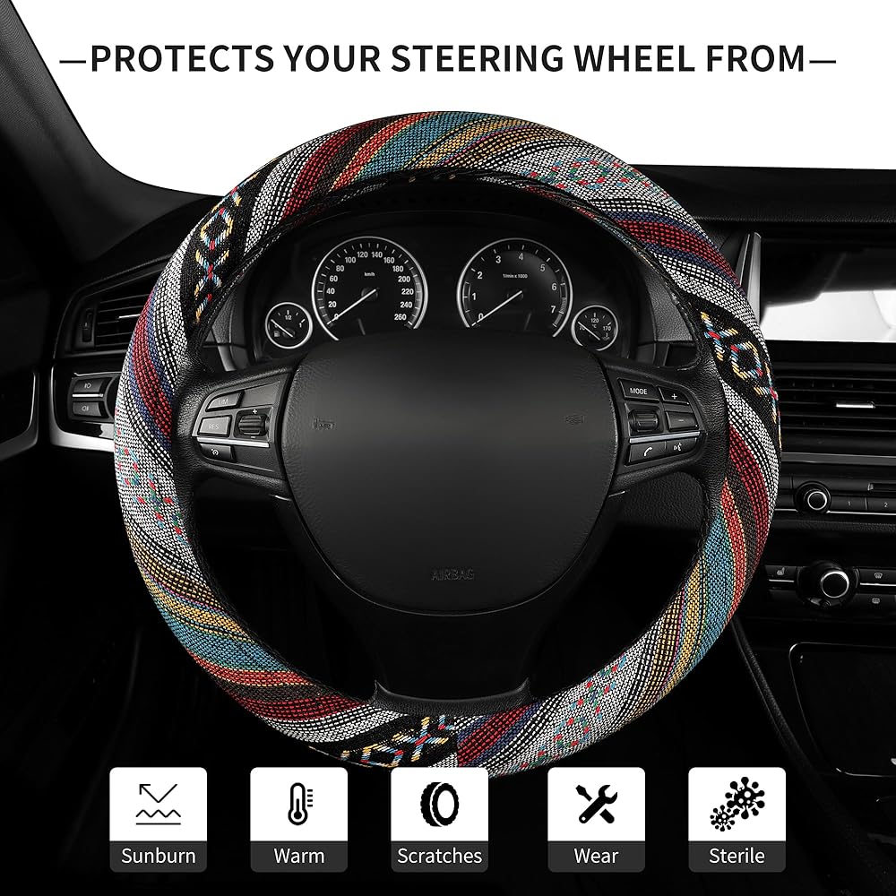 The surface of this steering wheel cover is adorned with richly colored aesthetic patterns, which is one of the quintessential boho elements. Varied tones of rich fuchsia mingled with a dark blue or turquoise give your wheel cover a hand-woven, dreamy accent.