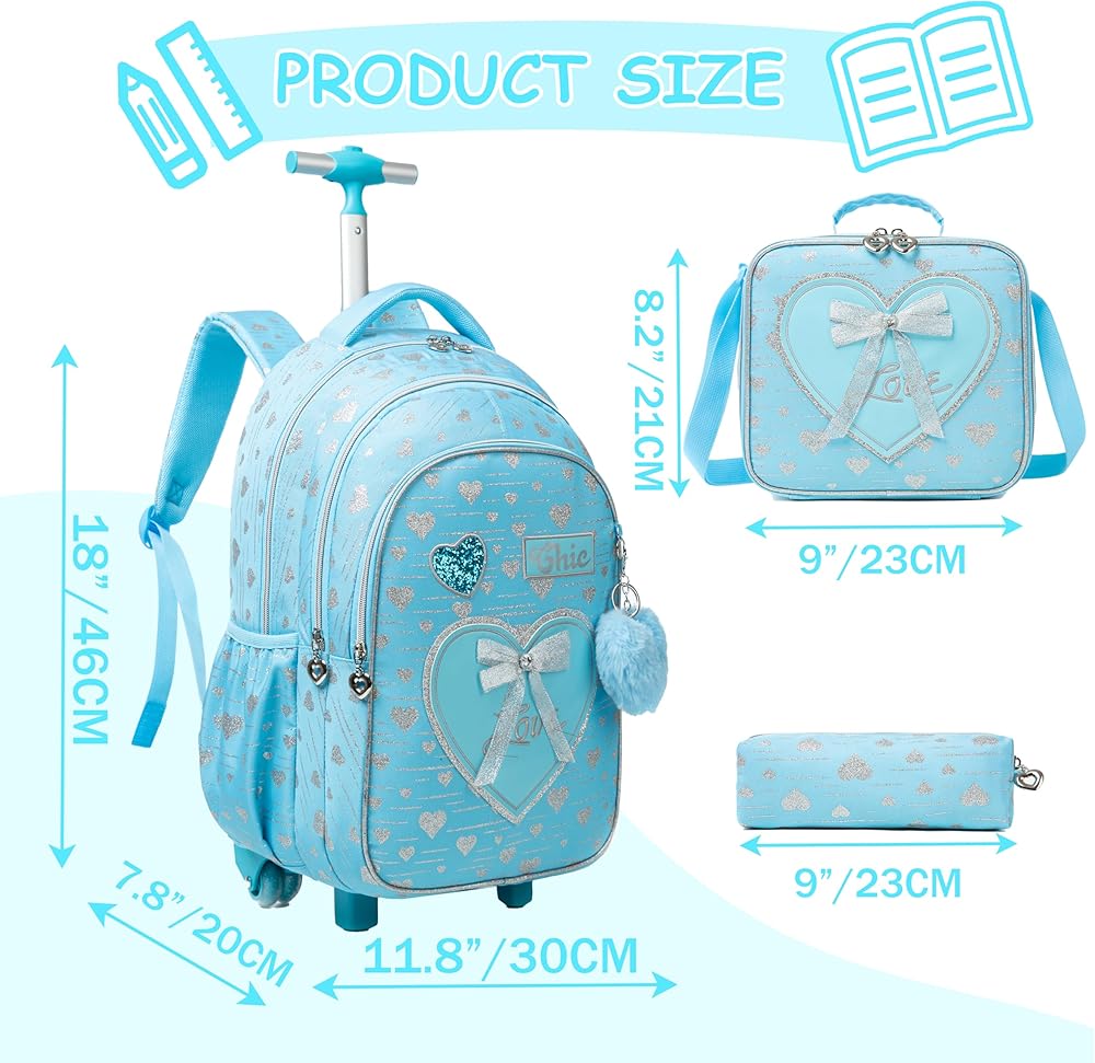 • ♥Rolling Backpack Size: BACKPACK:16.9x11.4x5.9inch/Pencil Case:9.4x8.6 inch/Lunch Bag:7.87inch