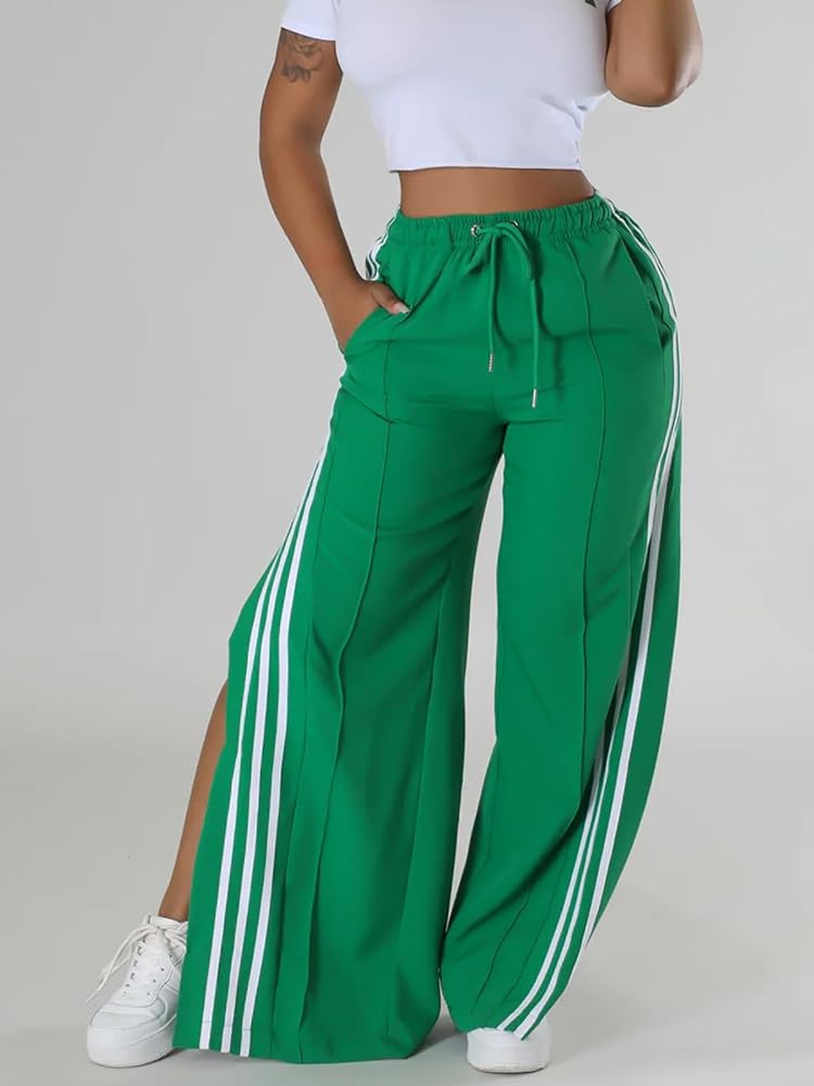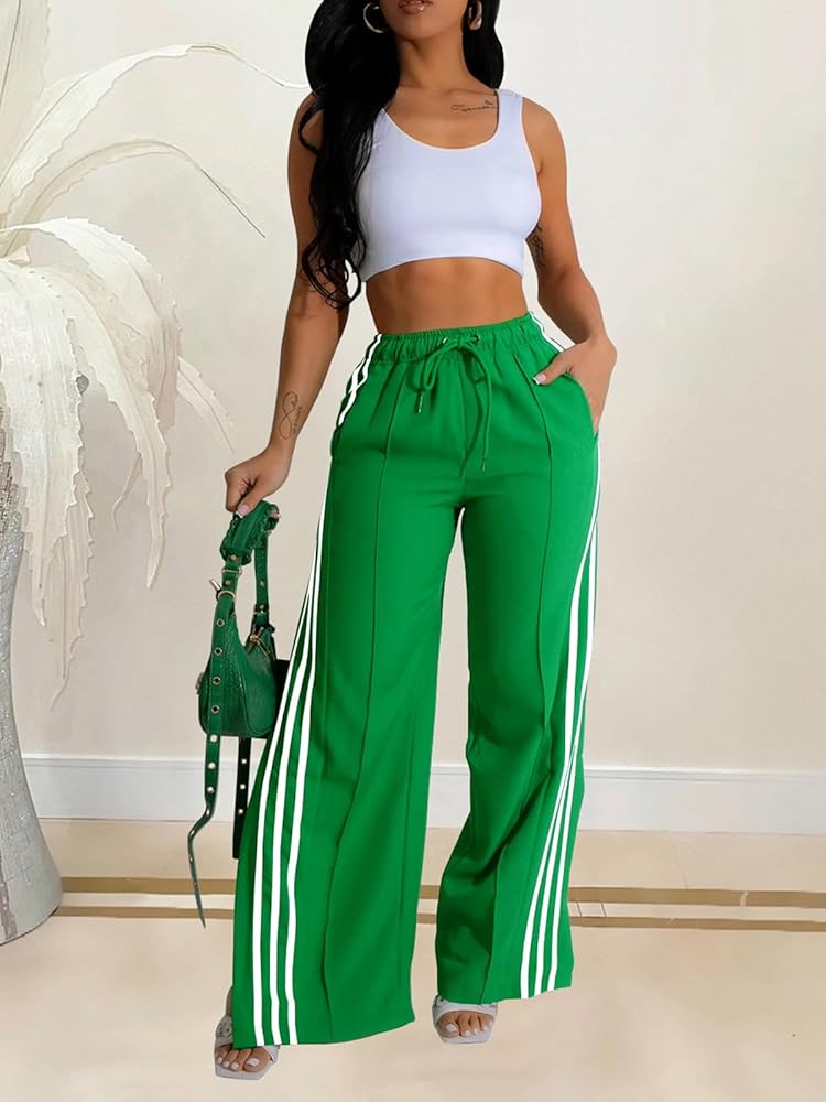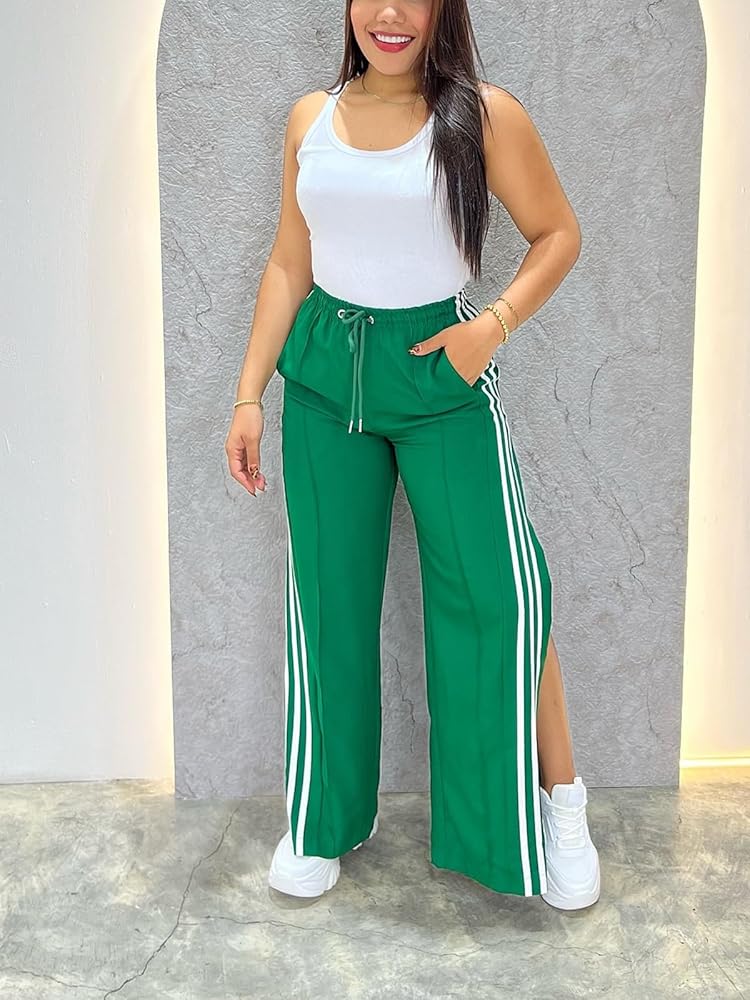 [Features]: High waisted pants for women, wide leg pants offer a flexible experience, striped pants with two side slit design, straight legged, two side pockets, the womens elastic waist pants with adjustable drawstring allows for maximum comfort and a customized fit. Casual pants for women 2024, sweat pants women baggy, loose style.