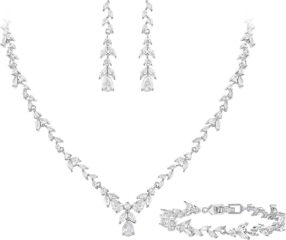 If you are going out to a party or banquet, This April birthstone bridal wedding dangle earrings necklace bracelet set is the perfect accessory that will enhance your outfit. With a fabulous Marquise-shaped, round and teardrop CZ design and solid construction. It features sparkly CZs which will make a timeless accessory to any jewelry collection. This wedding jewelry set can be worn with classy casual or formal attire.