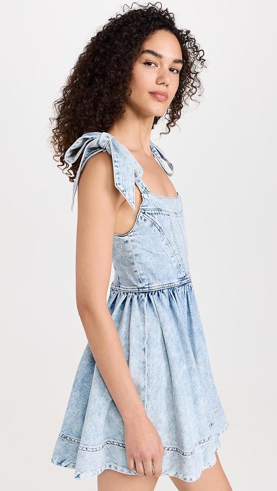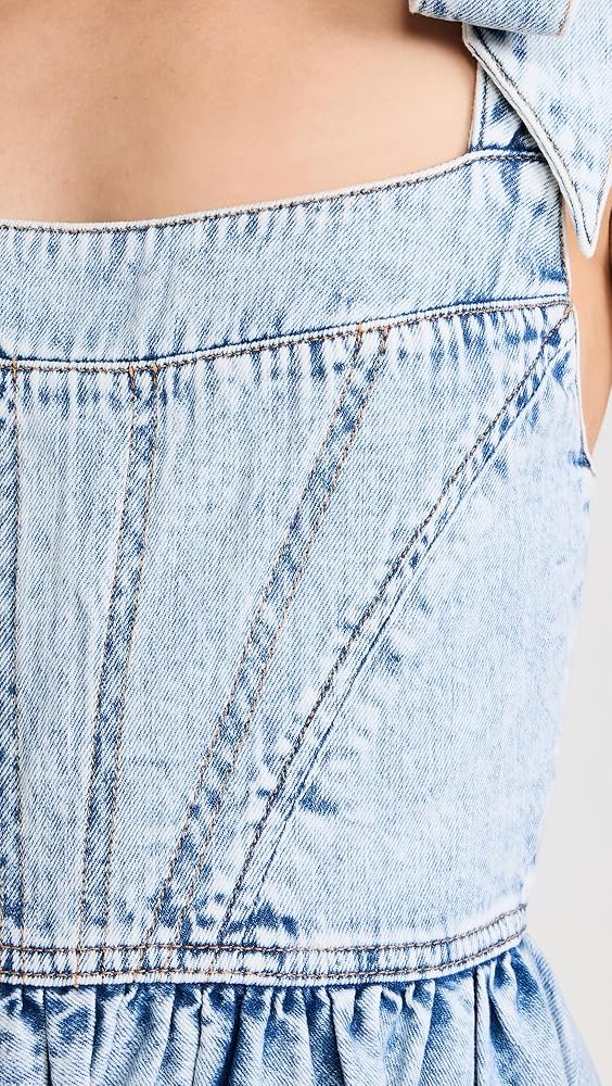 Tie detail at shoulder straps, Corset-inspired stitching at bodice, Gathered waist, Smocked elastic back panel
