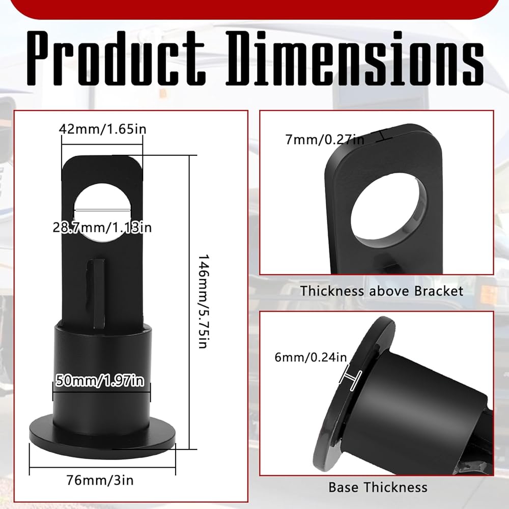 SPECIFICATIONS:The height of the lifting bracket is: 5-3/4'', the diameter of the round hole is: 1-1/8'', the diameter of the base is: 3 inch, the weight capacity is about 500 lbs, part number DM6100. The DM6100 fifth wheel accessories is small in size, you don't have to worry about taking up space when you are travelling, and it is easy to carry around