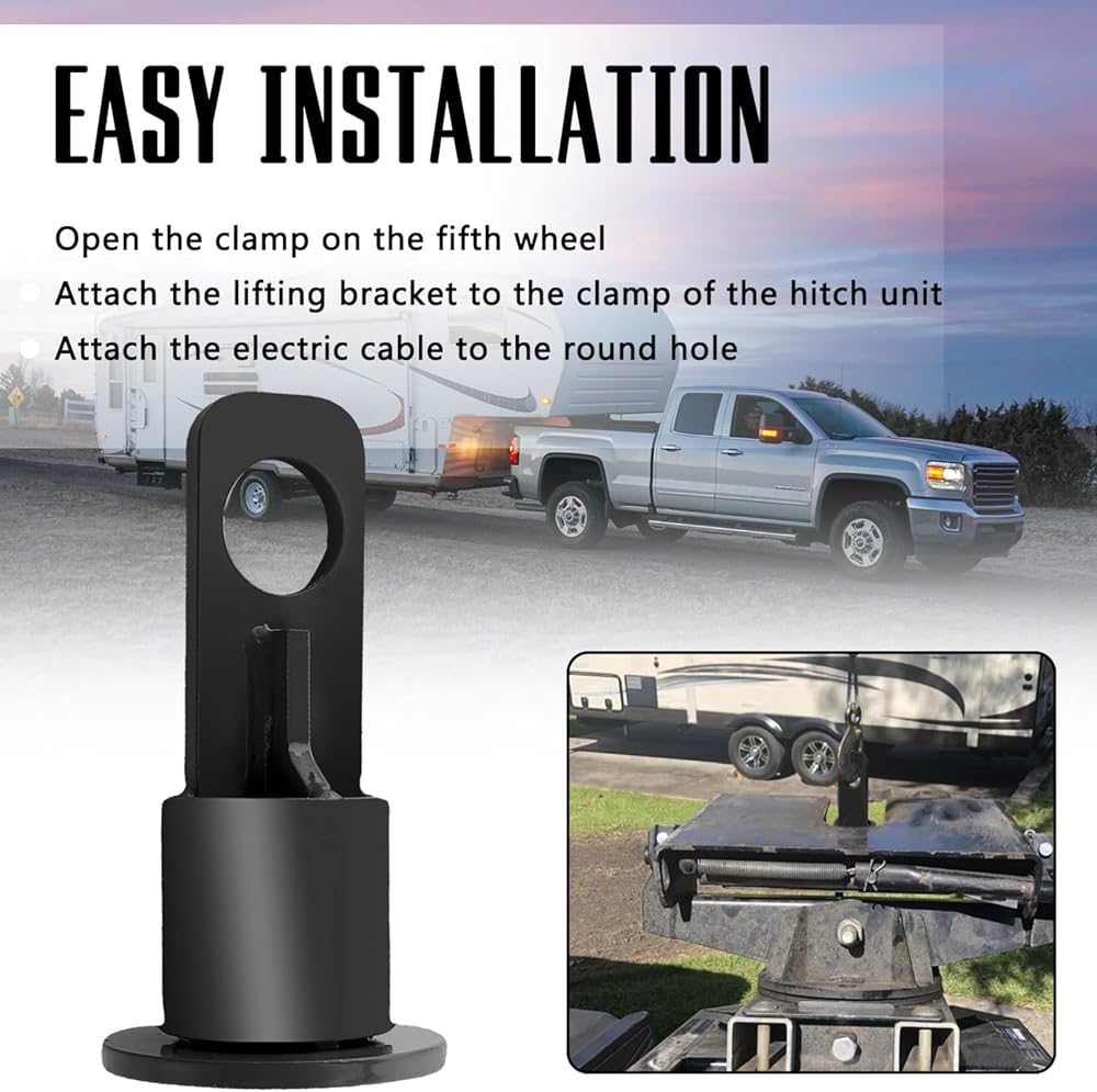 EASY INSTALLATION: Simply open the clamp of the fifth wheel and install the lifting bracket to the clamp of the hitch unit so that it is firmly fixed. Then attach the cable rope to the round hole and you are ready to use. Note: Please make sure your fingers are safe during operation to prevent them from being pinched by the clamp