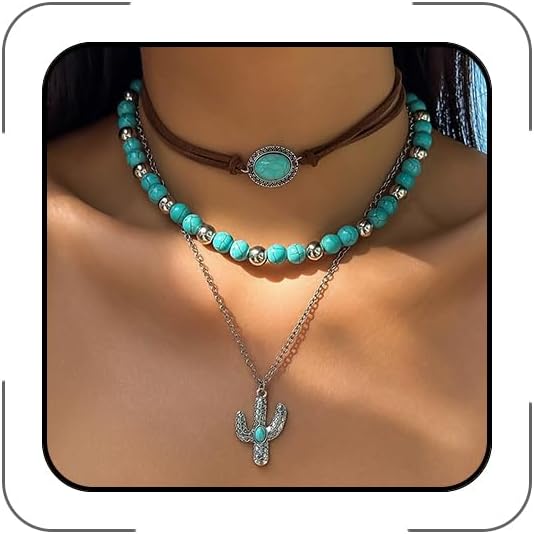 Boho Necklace for Women: This turquoise necklace set features a trendy layered look with multiple strands of turquoise beads and western-inspired charms like cacti, ox skulls, and crosses.