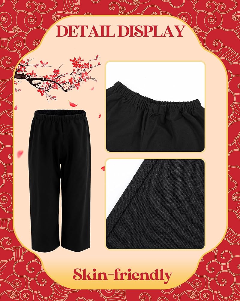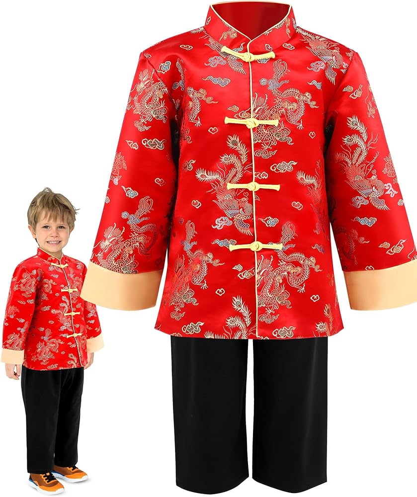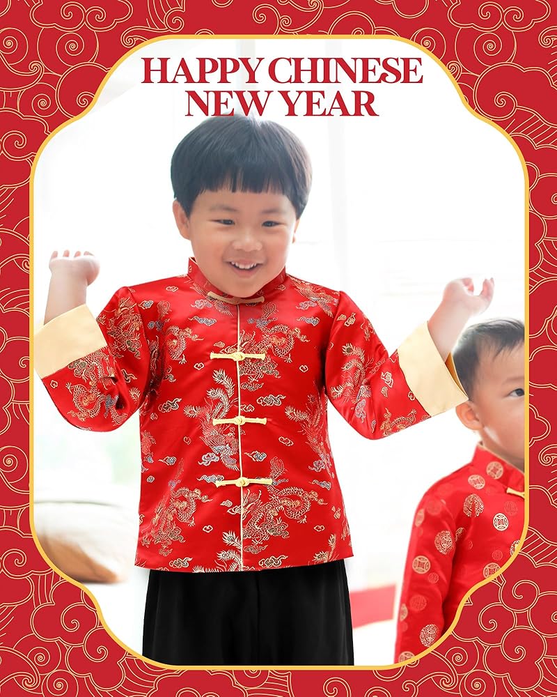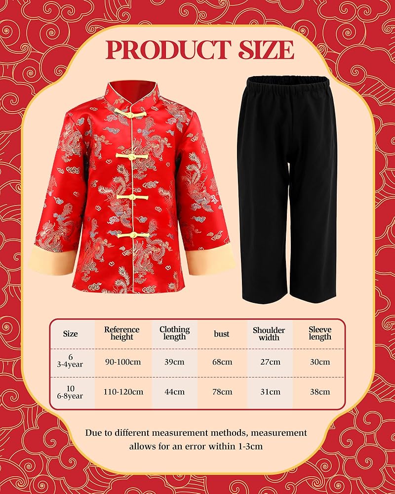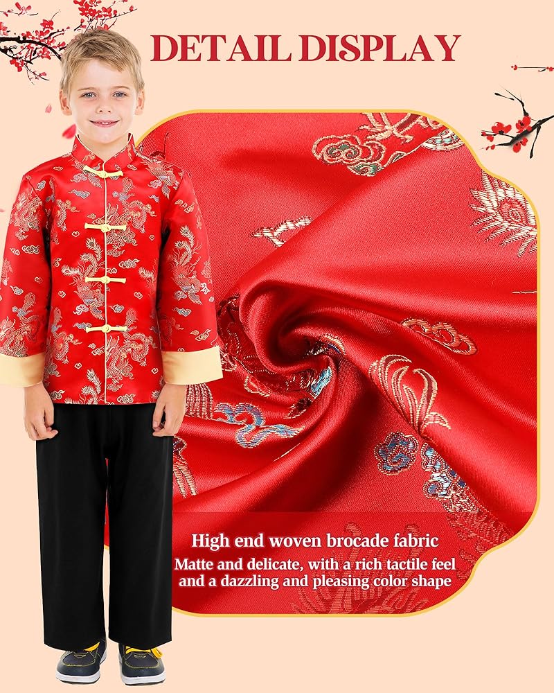 Complete Package: this package delivers a complete Chinese New Year Tang style suit, including a Chinese New Year Tang coat and a pair of black trousers; The package contributes to the authentic feel and the enthusiasm of the celebration; The child will feel immense joy by diving into the atmosphere of the occasion in this beautiful ensemble