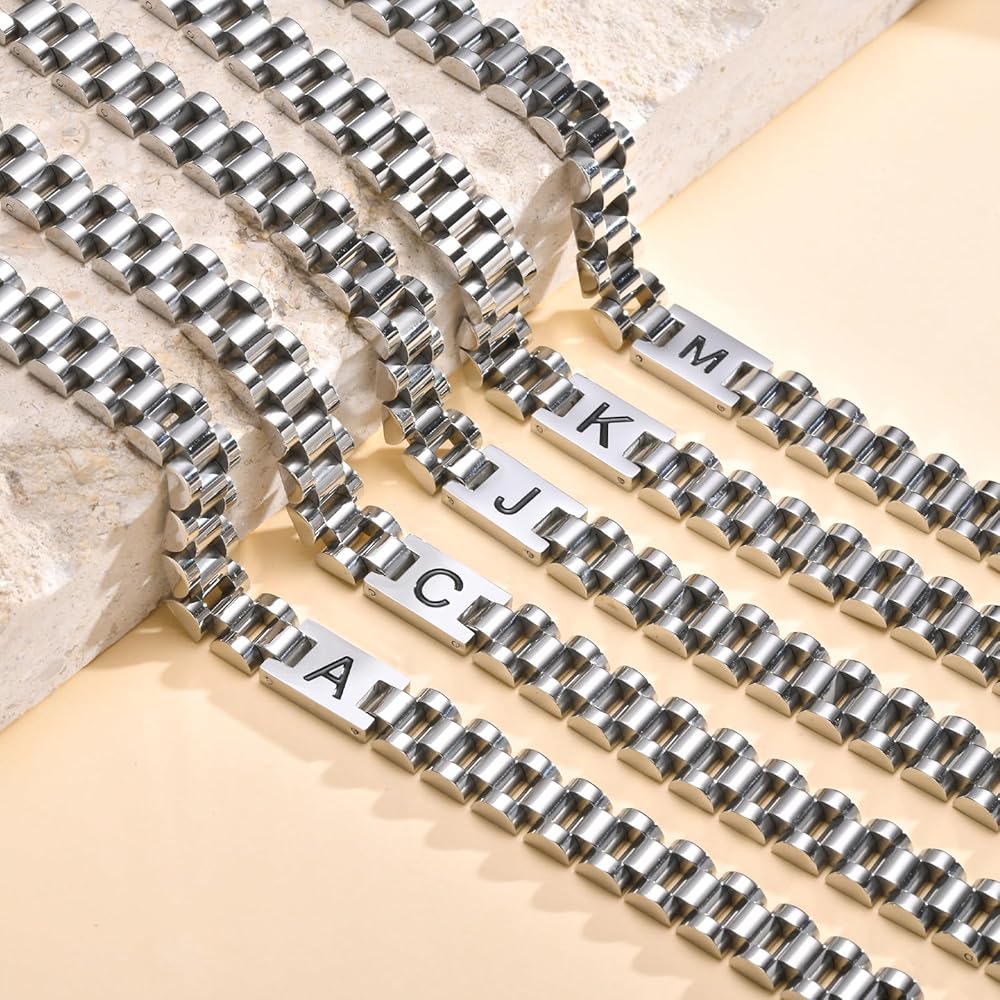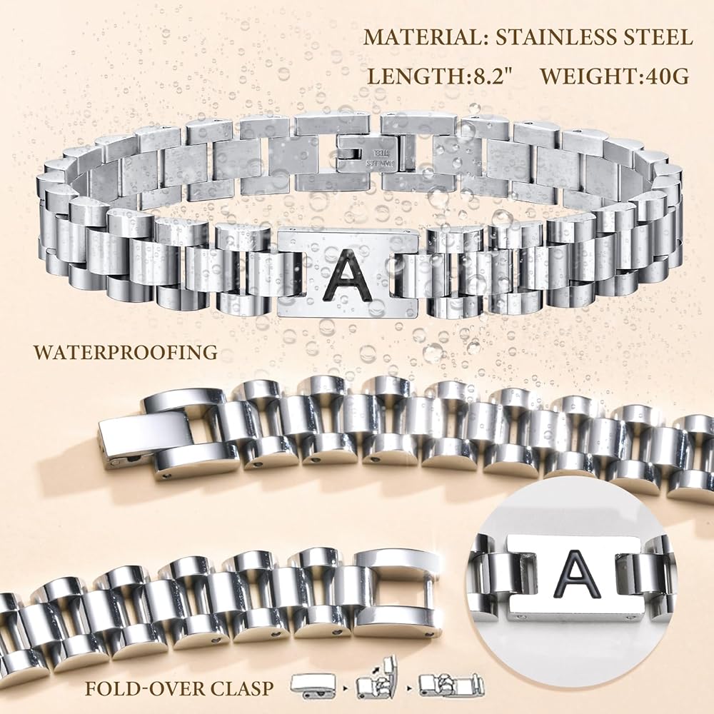 VNOX Initial Bracelet for Men - Stainless Steel Watch Band A-Z Letter Silver Link Bracelets,Fathers Day Gift for Dad Boyfriend Teen Boy Women Mens Jewelry Gifts for Him