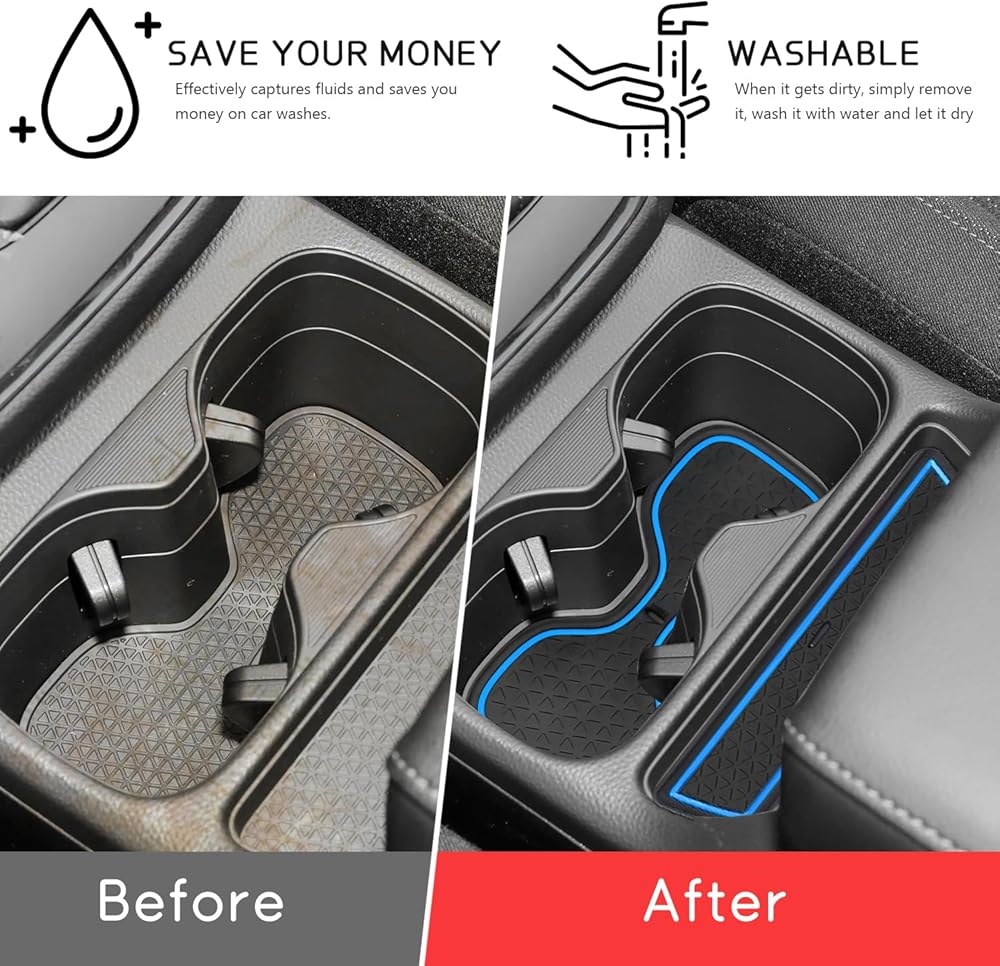 Perfect Design: The center console mat is specially designed with 3D texture to catch spills and double-raised edges to contain them. and the Non-slip bottom can tightly attach to your cupholders and center areas so they stay in place. and these liners add a nice pop of colour to the corners of your vehicle.