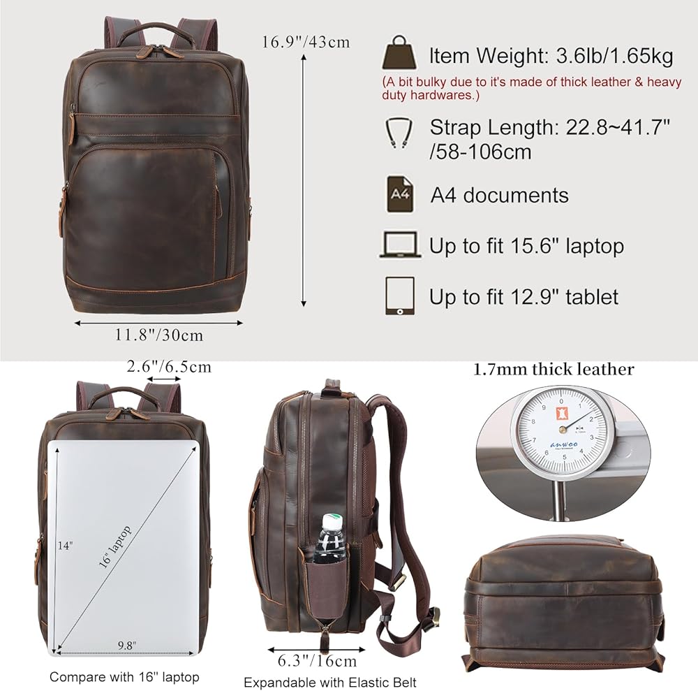 【Practical Large Backpack】Size:11.8"(L)x6.3"(W)x16.9"(H); weight: 3.6 lb (a bit bulky as its thick leather & hardware to withstand test of time); adjustable strap length: 22.8 - 41.7"; strap width:2.6". The leather backpack bag for adult men suits for business travel, outdoor camping,casual city trip, or daily work commuting. It can be a men's laptop backpack, business travel backpack, weekender backpack for trip, carry on backpack for flight.