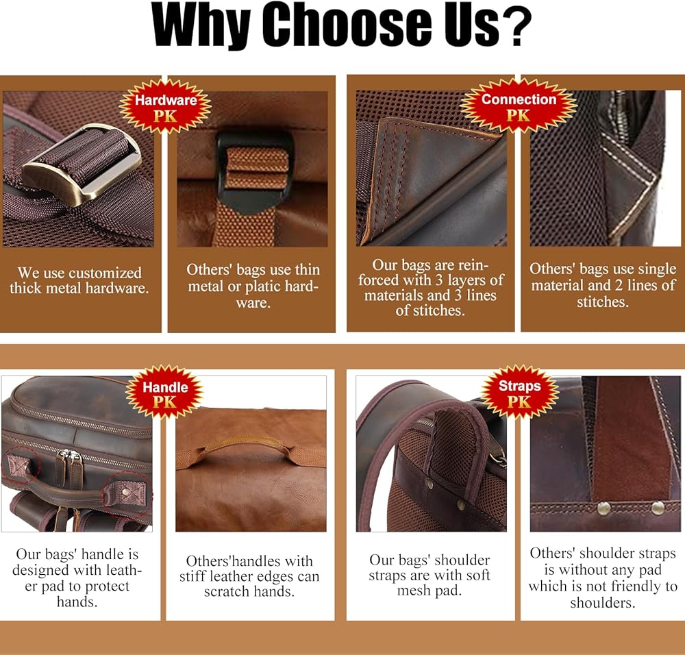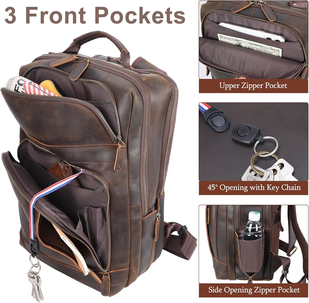 【Thick Material】The men's leather backpack is handcrafted of real full grain cowhide about 1.7mm thick, processed with crazy horse leather tech, featured with its durability and natural texture of cow skin, thus each bag is unique. Being retro weathered look when it's new, the more you use the backpack,the shinier the leather will be.Ykk metal zippers and customized thick metal clip, reinforced metal rivets to ensure the leather laptop backpack to last long time.