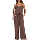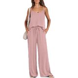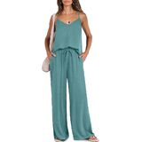 【Features】 - V neck and spaghetti adjustable straps tank top, loose wide leg pants with pockets.