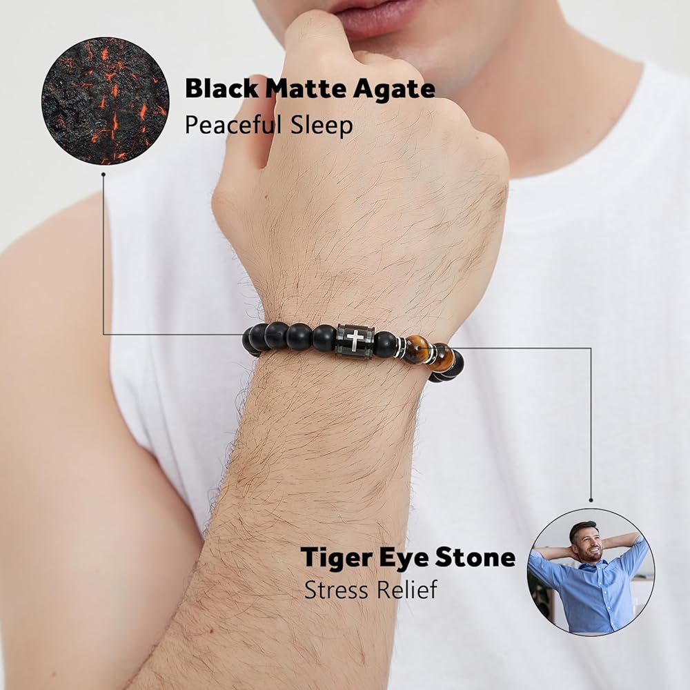 MATERIAL - This simple men's bracelet is made of black agate and tiger eye stone. Its cool touch provides a soothing effect, relieving stress and anxiety. The bracelet serves as a reminder of love and support. The stainless steel components are strong and durable, lead and nickel-free, hypoallergenic, and healthy.