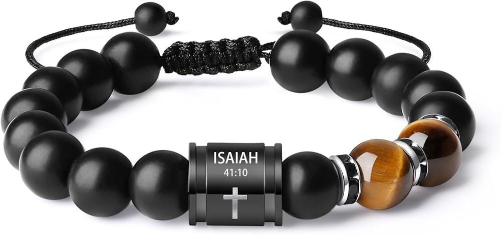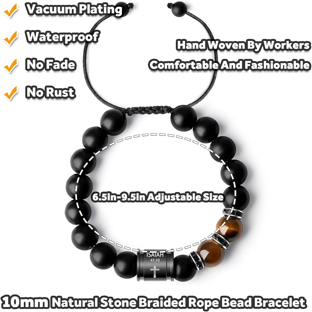 Bible Verse Cross Bracelets for Men Handmade 10mm Natural Black Onyx, Lava Rock Stone, Tiger Eyes and Black Matte Agate Bead Braided Rope Meaningful Gifts Bracelet for Men Father Boyfriends Husband