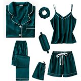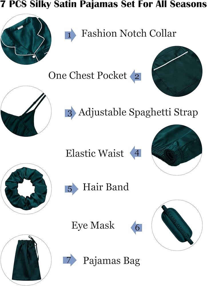 【Pjs Set Features】--- ❤Cami top: The cami features with an adjustable spaghetti strap so you can easily adjust its length. Sexy V-neck shows your chaming collarbone.❤Satin sleepshirt: Casual-fitting buttoned sleepshirt features short sleeve, a chest pocket and Classic notched collar. ❤Cute Shorts: Designed with elastic drawstring waistband to make you wear more comfortable and close-fitting.❤Long Pant: Loose-fitting pant with contrast piping along hem.