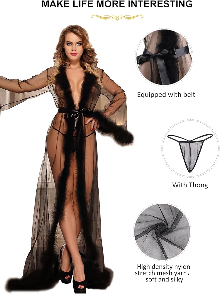 Sexy Robe: Sheer robes featuring long sleeve, oblique v-neck, satin belt, faux fur trim at the sleeves or lower hem, show your body perfectly, make you looks more elegant