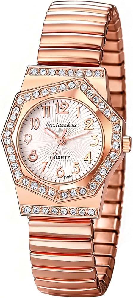 【Features】Rosegold Elastic stretch band; Asymmetric octagonal watch face; Rhinestone decorated bezel; High hardness glass with Arabic numerals.