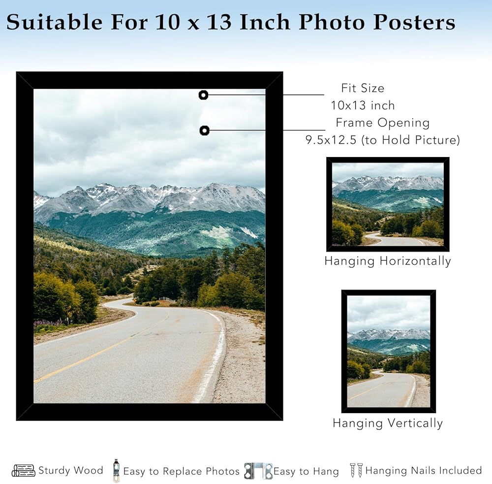 Multifunctional Application: The 12 by 17 black frame has a minimalist design and has 2 hooks on the back, you can hang the frames horizontally or vertically, you can decorate your home, office, dormitory and hostel. The photo frame display opening will be 0.5 inches less, it is to prevent the photos from sliding down and display the photos better.