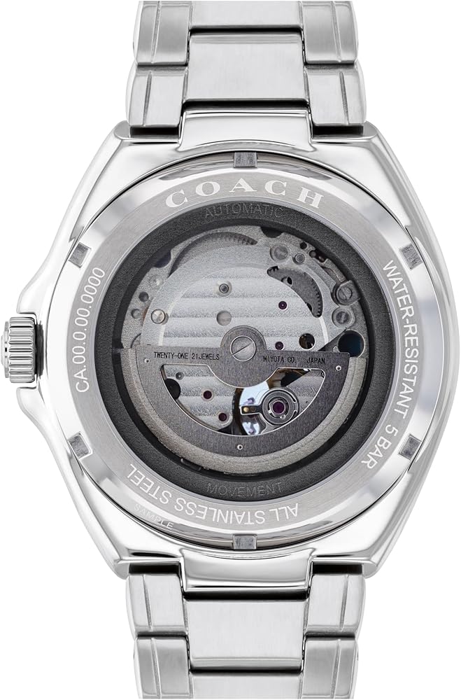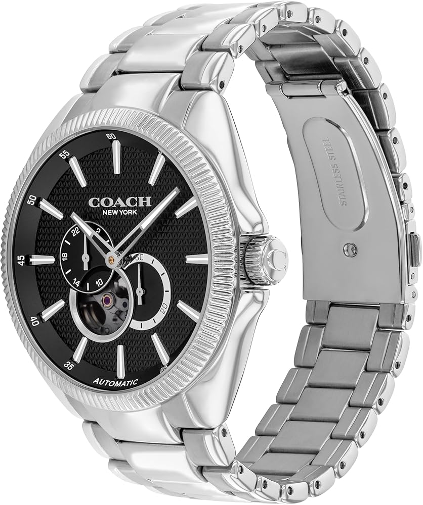 Combining discerning style with rugged functionality, Jackson is made for life on the move. This stainless steel watch features a black textured dial with two sundials and an open-work window showcasing mechanical movements.