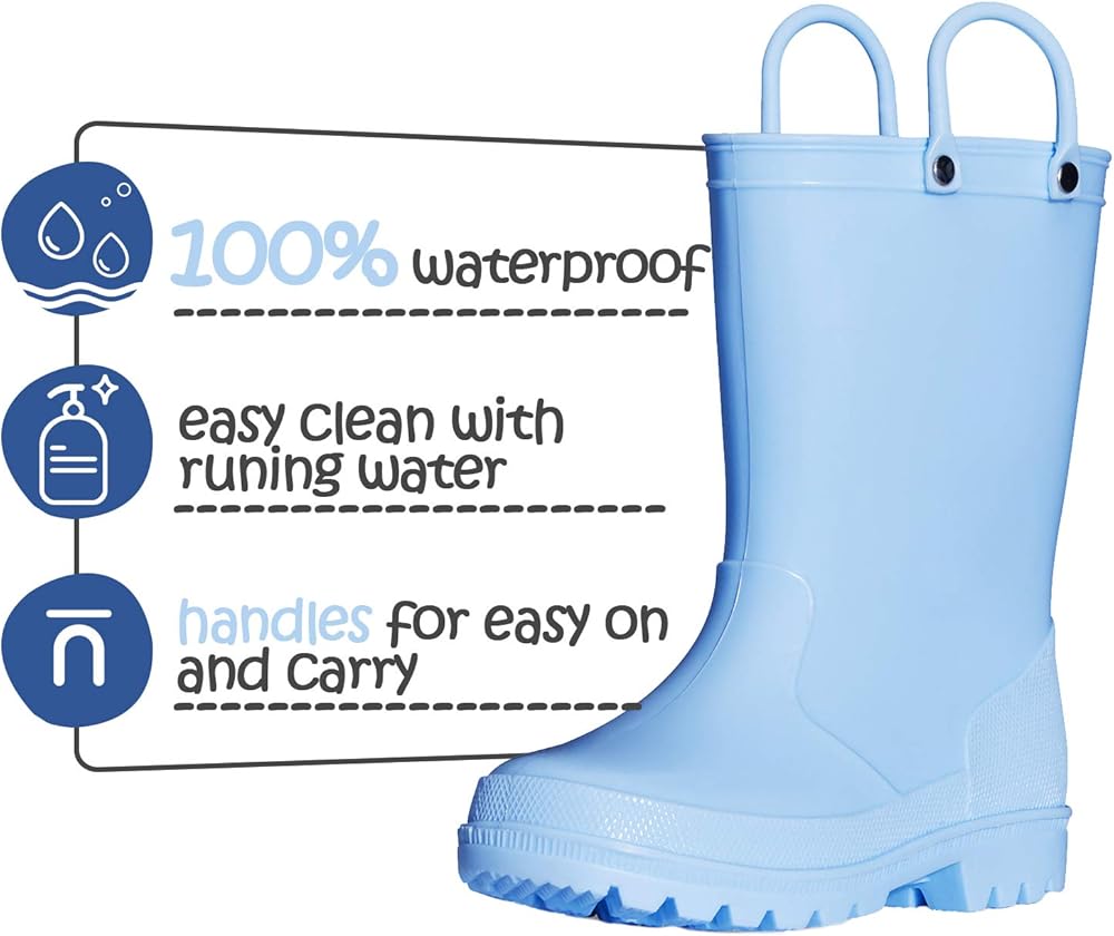 Sturdy and Lasting Longer:All our kids rain boots are made with waterproof environmentally friendly material,doesn't have a strong odor like the alternatives, and lasts much longer. Ours is a high-comfort material that allows for a better flex and rebound. The zero-drop heel design makes walking easier for children.