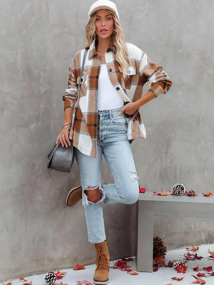 Feature:front button closure;Two buttoned chest pockets and side pockets;Long sleeves with button cuffs;plaid pattern;loose fit shacke;This shacket is a must have in your closet