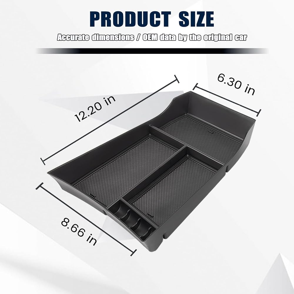 Categorized Storage: The center console tray internal compartment design; Its design allows you to easily store and organize essentials like cellphones, sunglasses, coins, pens, and credit cards