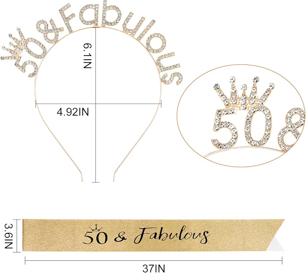 One Size Fits All-The birthday sash is 63.77 inches long, and our sash fits all types of bodies. The Happy Birthday set comes with pins to adjust the size of the 50 & fabulous sash. The width of the birthday headband can be stretched according to your head.