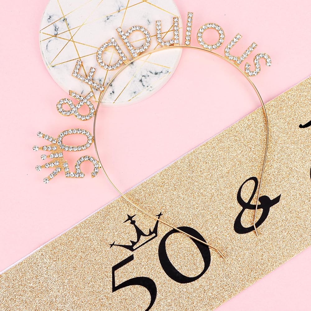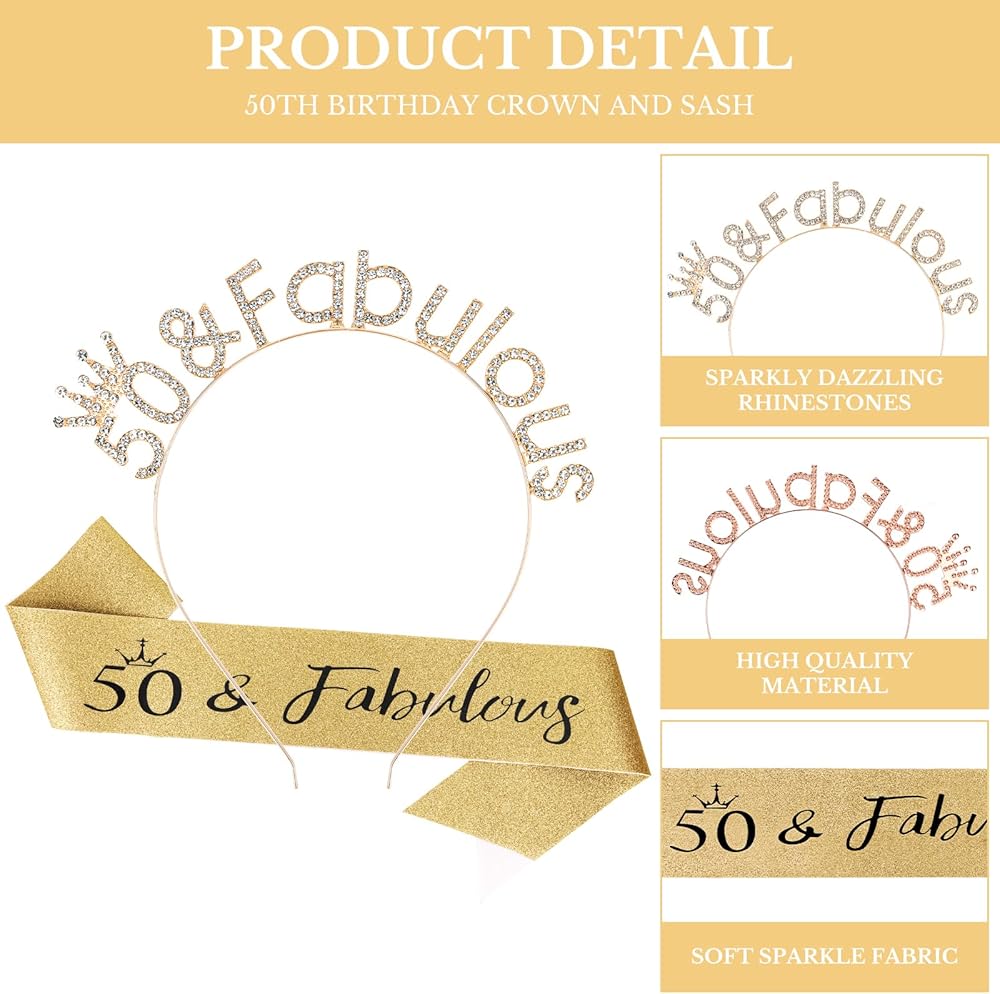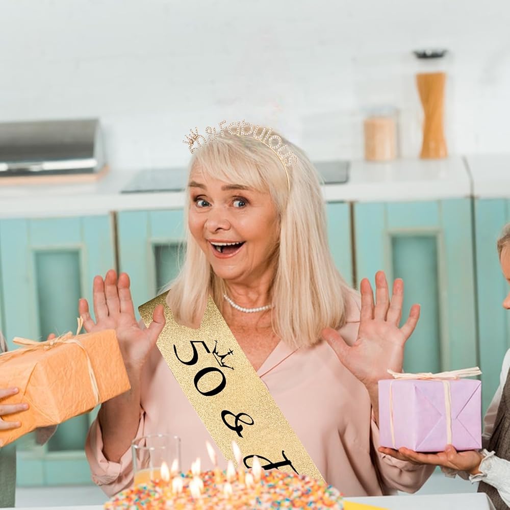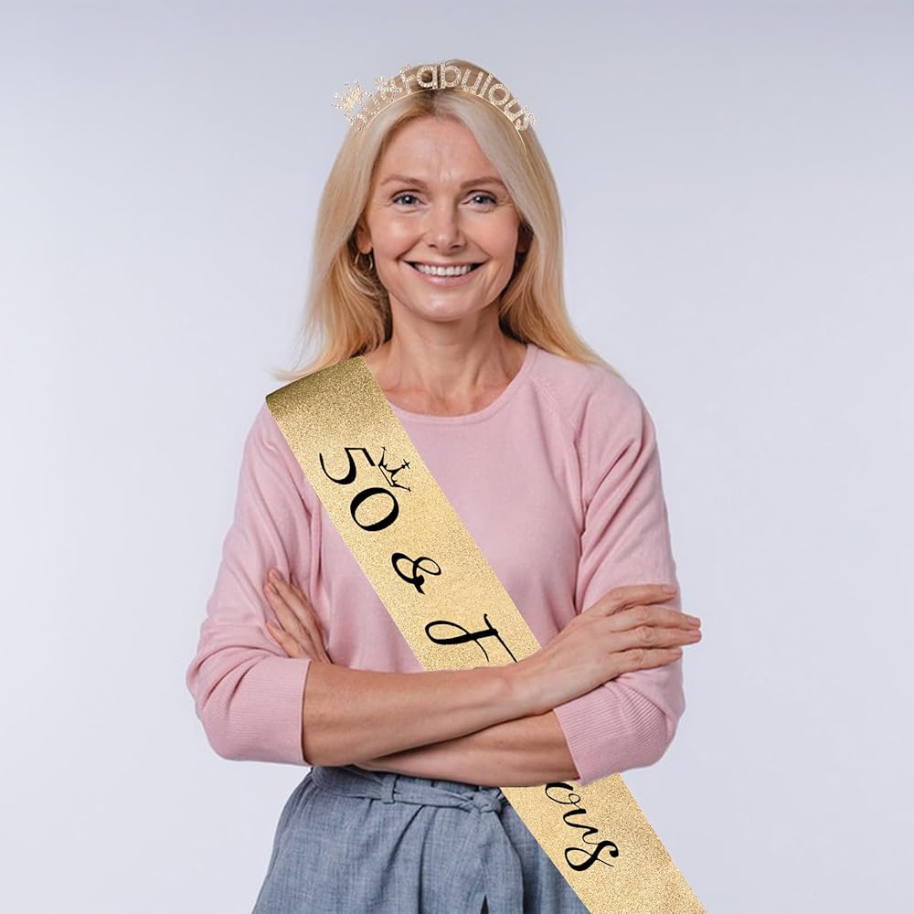 The Perfect 50th Birthday Crown for Women "50 & Fabulous” Sash + Rhinestone Tiara Gifts Set.