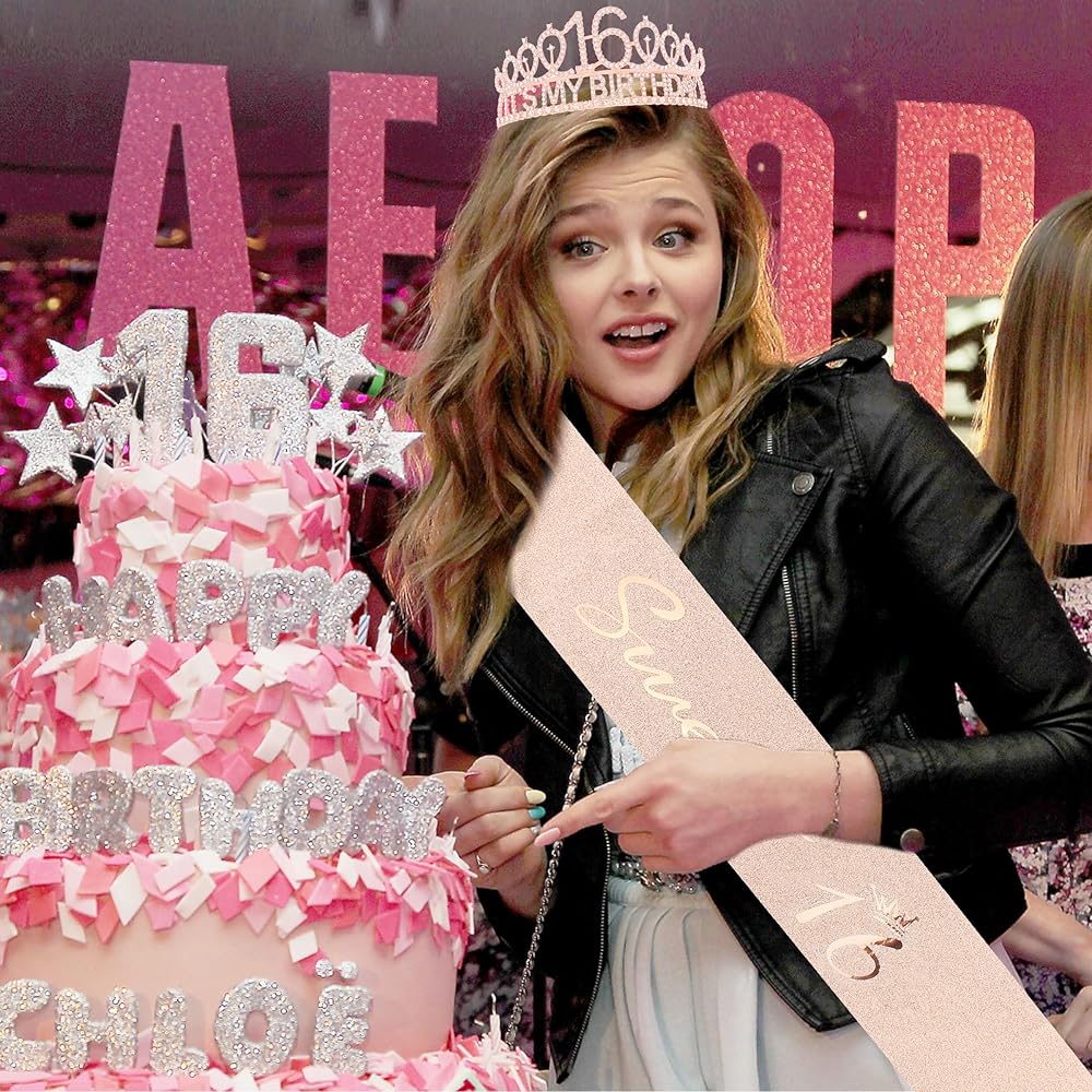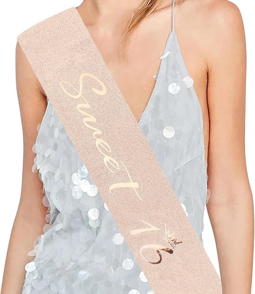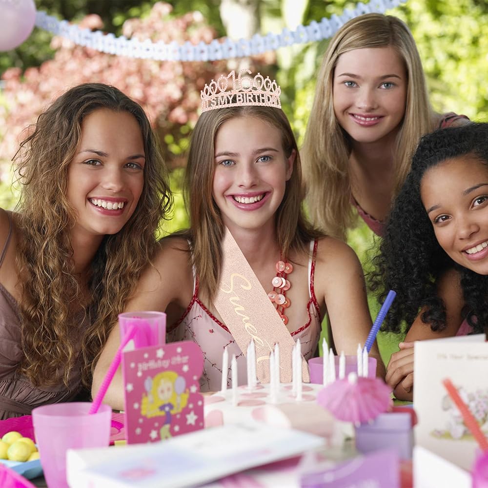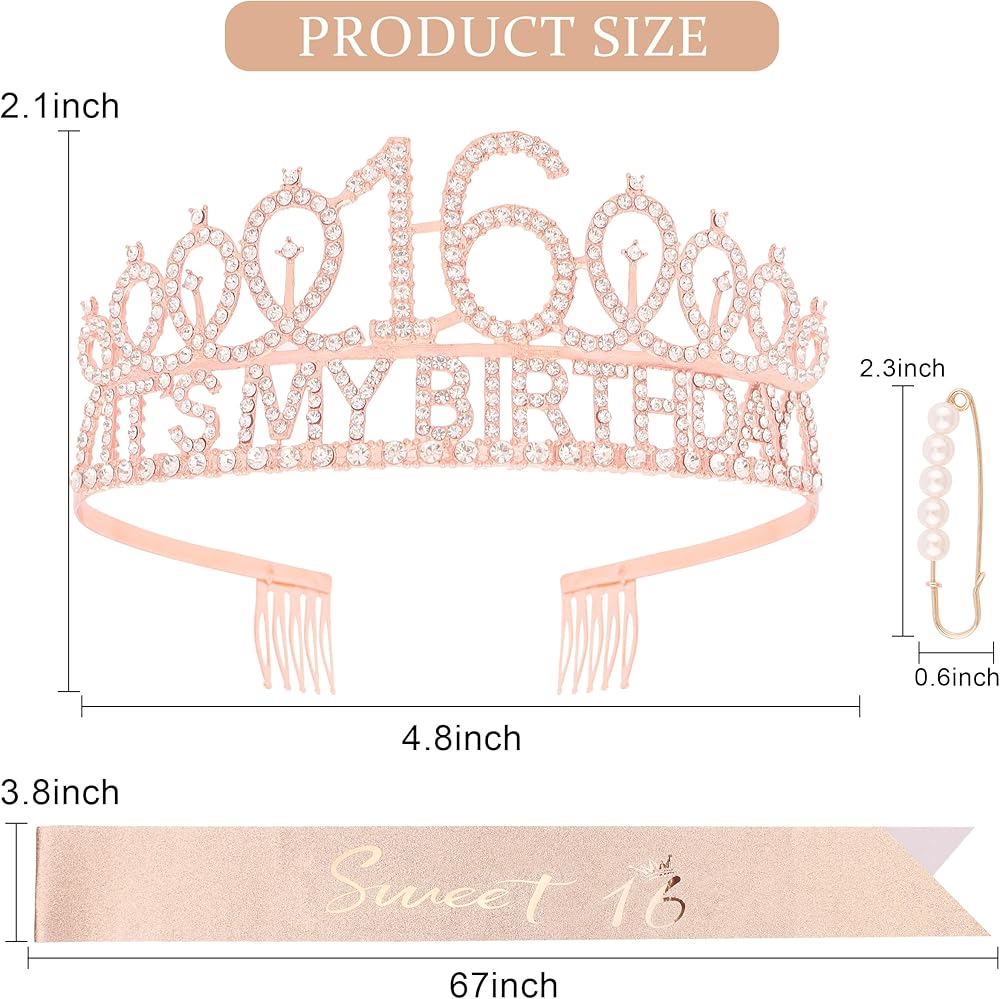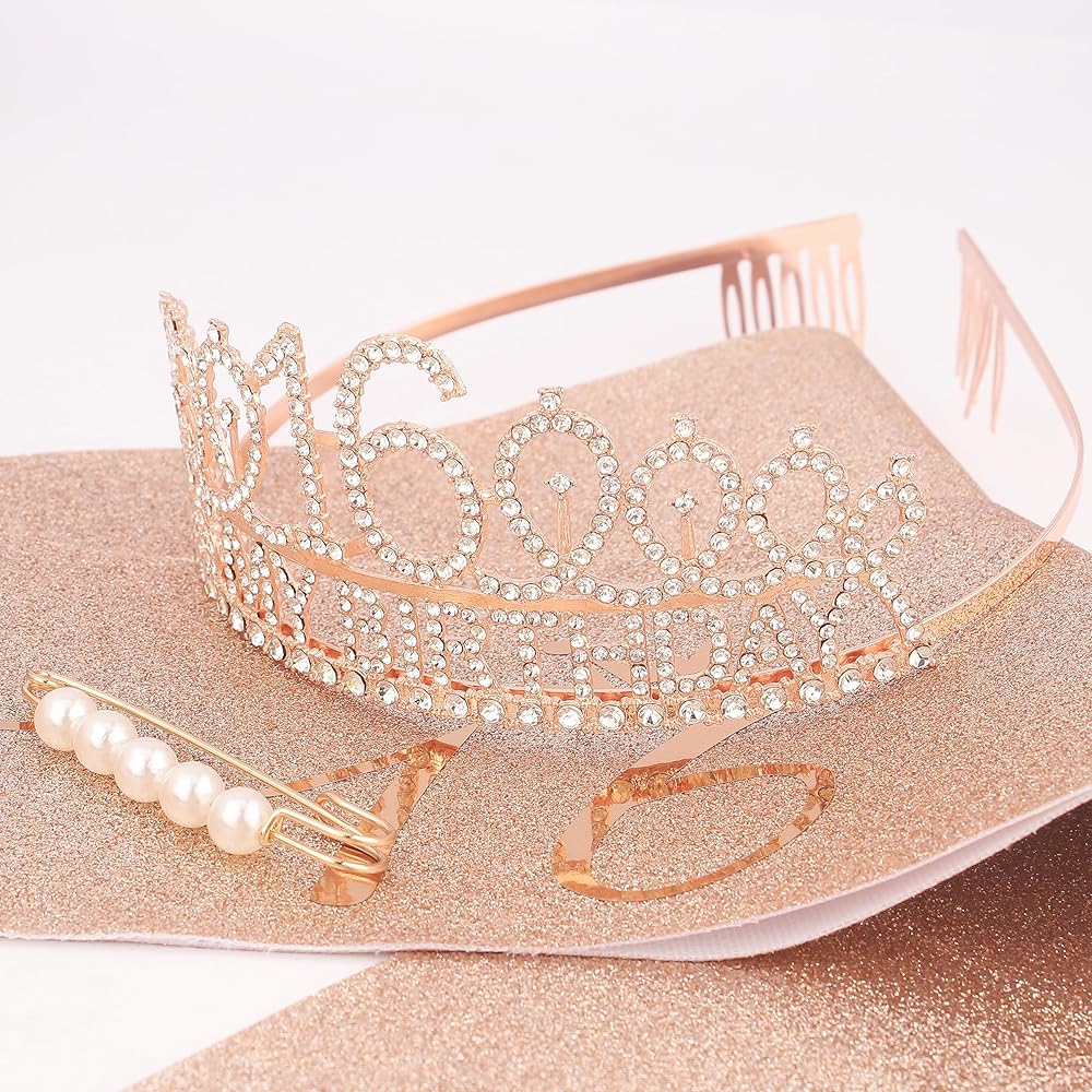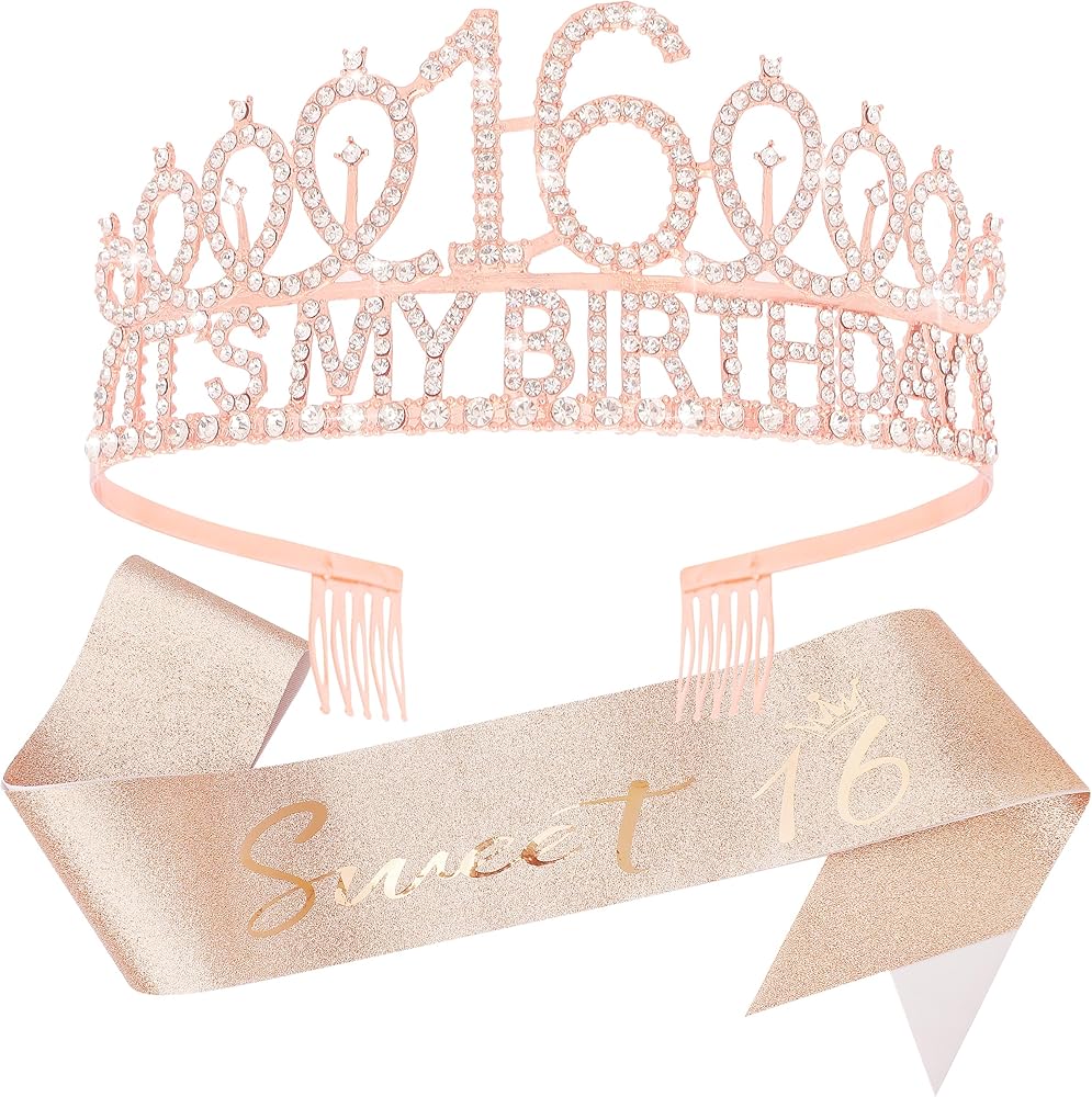 Add a touch of glamour to your 16th birthday celebrations with this elegant rose gold metal headband and sash set, perfect for girls who love to sparkle!