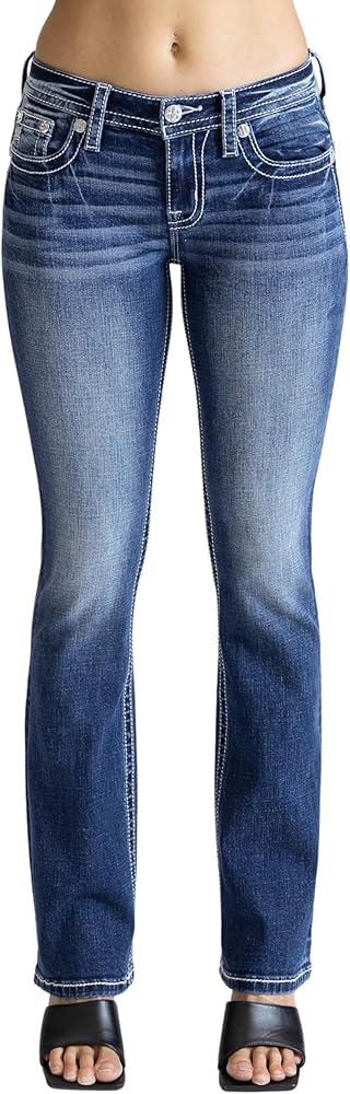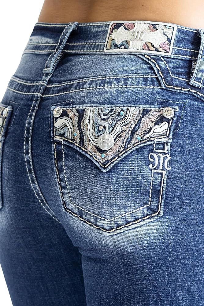 Discover the perfect blend of style and comfort with the Miss Me Women's Abstract Stitch Mid-Rise Bootcut Jeans. These mid-rise, dark-wash jeans feature thick stitch M design, enhanced by clear rhinestone rivets. The flattering bootcut design and slight fading add a touch of vintage charm. They offer a comfortable fit with just the right amount of stretch. Complete with a 5-pocket design and an M leather patch, these jeans are a versatile addition to your wardrobe.