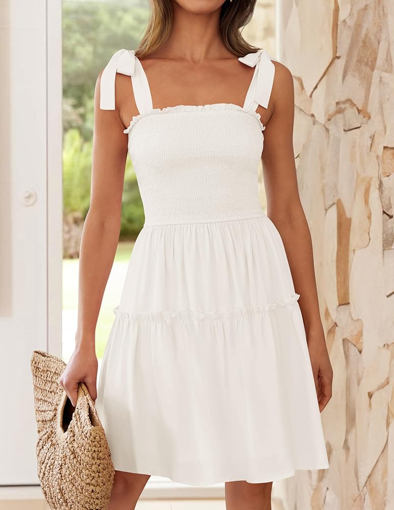 This swing dress offers a ruched bust complemented elastic waist, adjustable self tie straps, an open back and finished with a ruffled hemline.