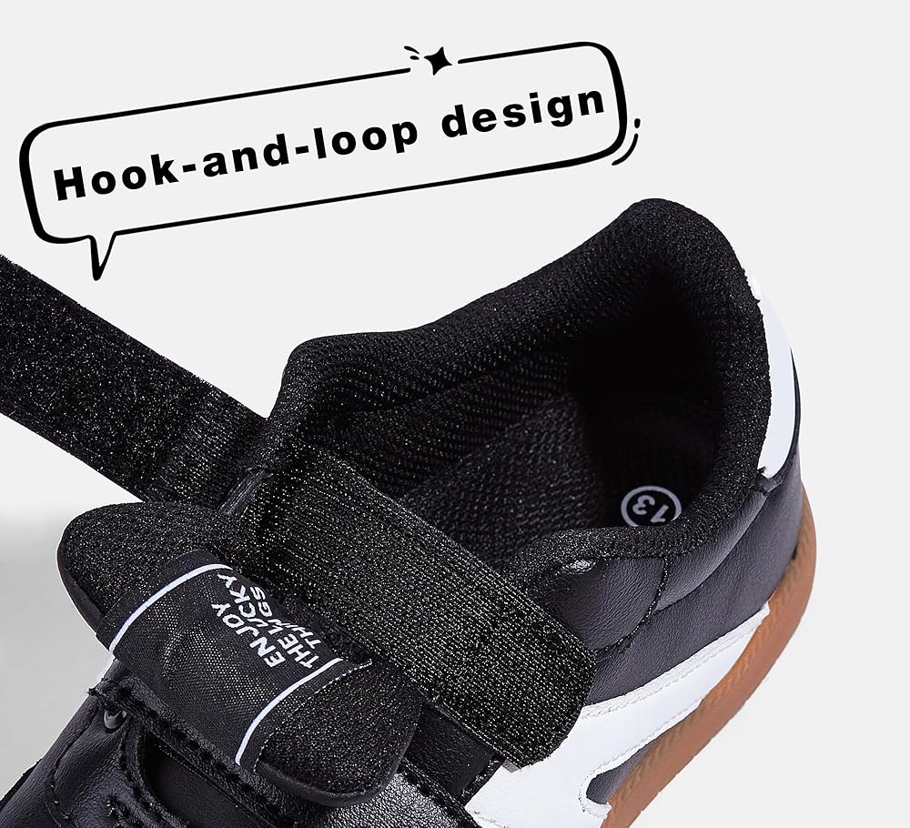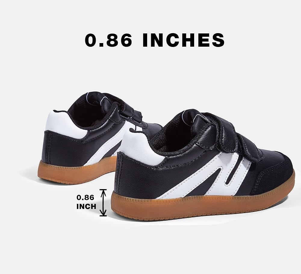 【Easy on and off】: With two adjustable hook-and-loop straps, these kids' minimalist school sneakers ensure quick and effortless wearing, empowering kids to put them on and take them off independently.