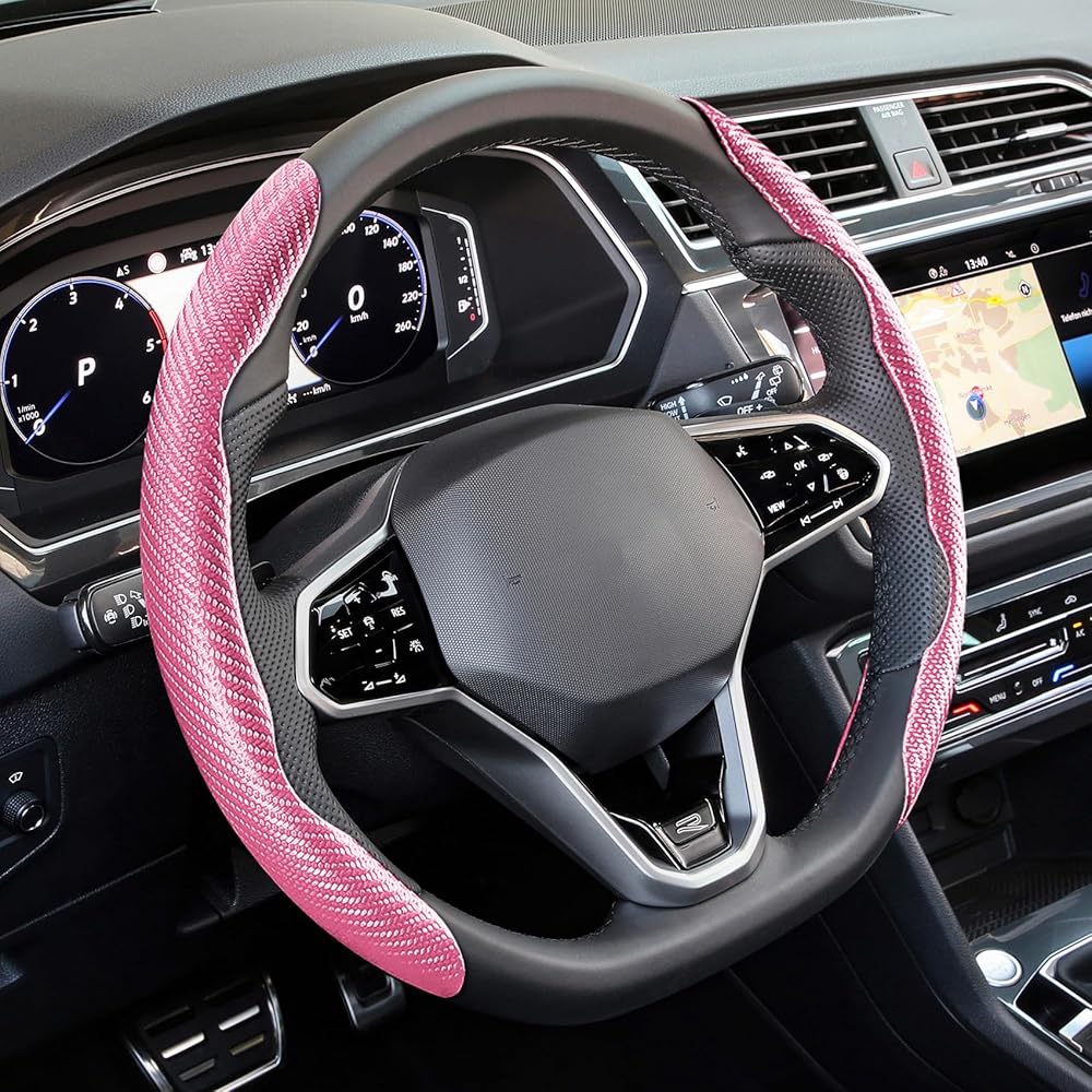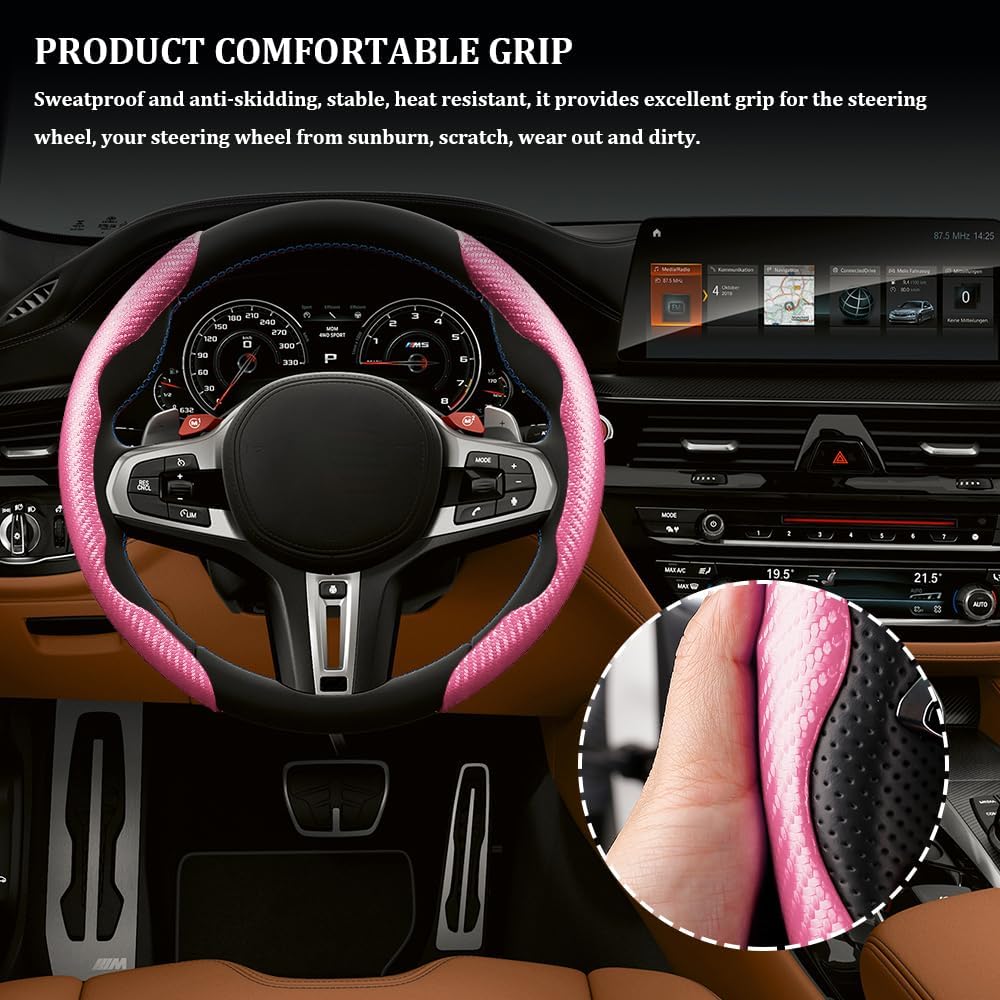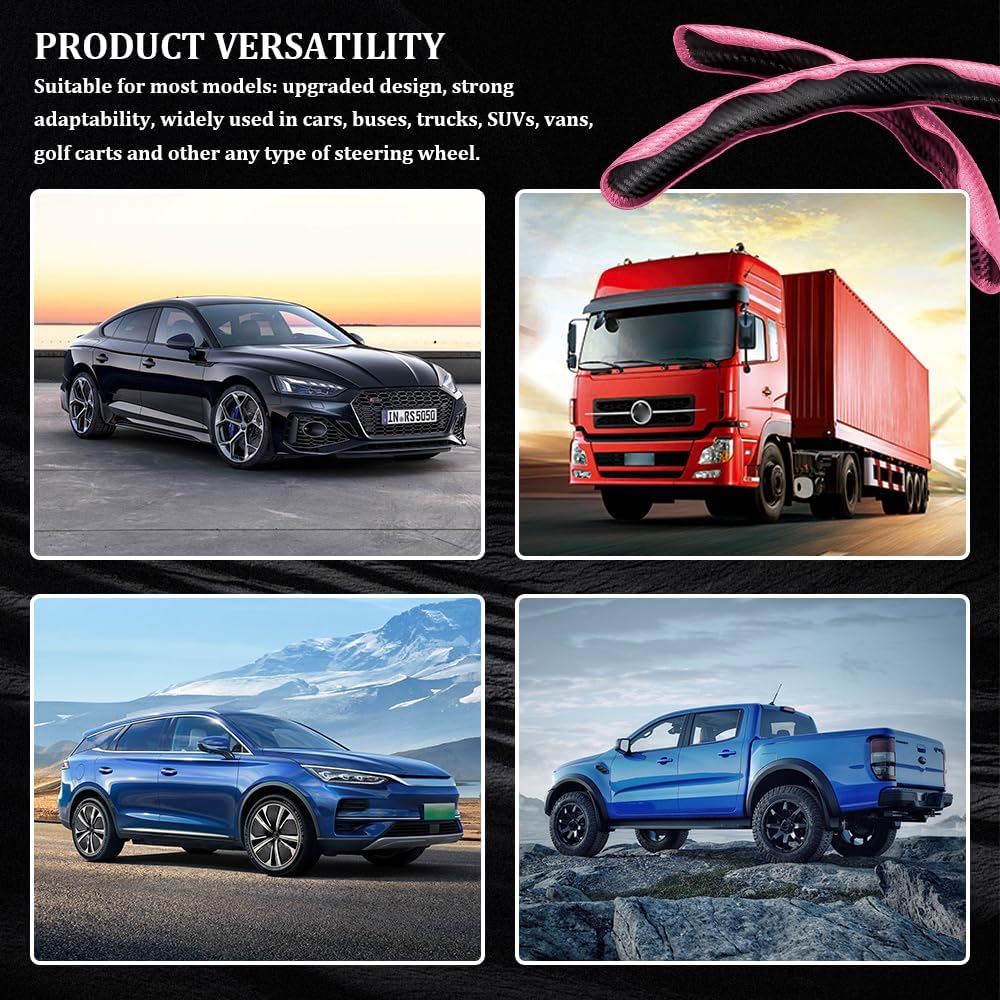 - This steering wheel cover is made of leather and PVC non-slip materials, which is breathable and suitable for all seasons, bringing a comfortable grip. It can not only prevent sweat and slip, relieve driving fatigue, but also protect the steering wheel from damage and improve driving safety. The appearance is available in seven colors, and the carbon fiber pattern is stylish and personalized, and it is handmade. Strong versatility, suitable for a variety of models, simple and convenient installation, no tools, easy to complete.