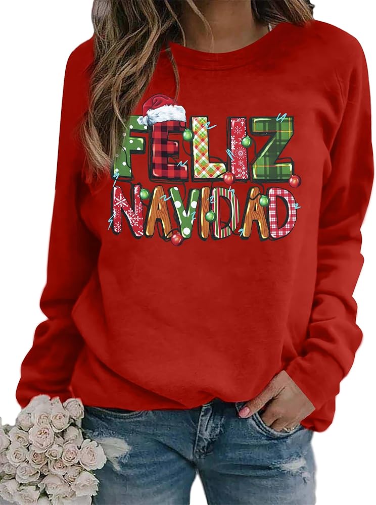 Occasions: Feliz Navidad letter print sweatshirt is suitable for Mexican holiday , Mexican Christmas party, Spanish family vacation, beach, casual, sports, office, social events, parties, school, street or daily life